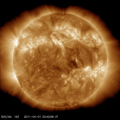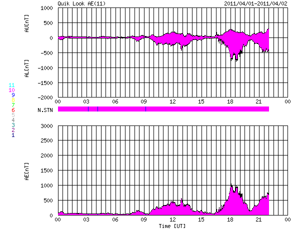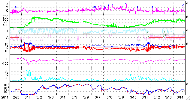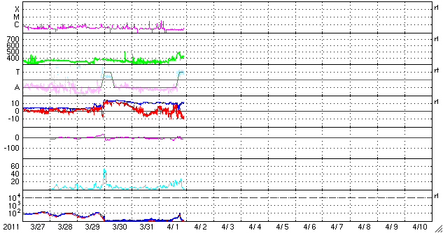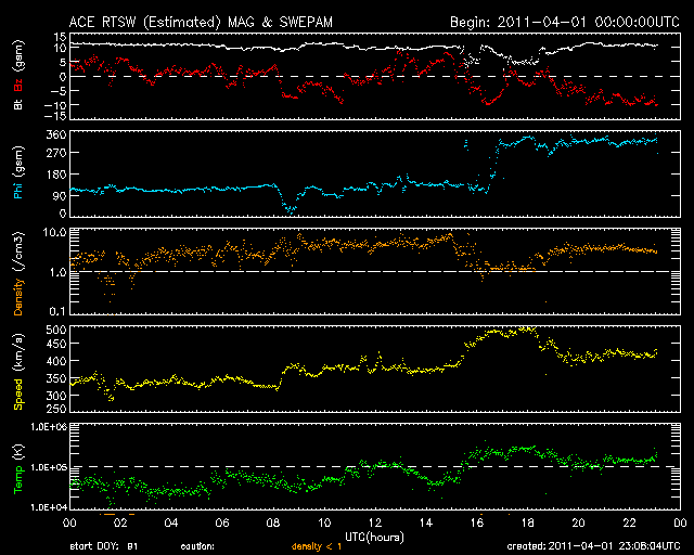 2011/ 4/ 2 08:08 更新 太陽風の速度が上がり、強い南向き磁場の影響で、強いオーロラ活動が発生しています。 担当 篠原 昨夜から、太陽風の状態に変化があり、 速度は、一時的に500km/sに上昇しました。 磁場強度は10nTと強まったままでしたが、 南北成分が南寄りの傾向に変わり、 -10nTに達する強い南向きが発生しました。 この影響で、AE指数は、 1000nTに達する強い変化を記録しています。 -8nTの強い南向き磁場は、現在も続き、 速度は400km/sにやや下がったものの、 引き続き、活発なオーロラが発生し、 小規模の磁気嵐も起きる可能性があります。 だいぶ通り過ぎましたが、 コロナホールの影響が来ているのかもしれません。 27日周期の図を見ると、 地球は、太陽風のセクター境界を通過していて、 太陽風の変化は、これとも繋がっている様です。 太陽は、南半球の西側に傾いた1176黒点群で、 C3の小規模フレアが2回発生しています。 東半球には、新しい黒点もなく、 今後の太陽のフレア活動は、穏やかな状態が続きそうです SDO衛星のAIA193カメラによる太陽コロナの様子 (c) SDO (NASA) ![]() SDO衛星による太陽の可視光写真。マウスの矢印を写真に重ねると、黒点番号付きの写真に切り替わります。 (c) SDO (NASA) ![]() ACEが観測した太陽風の磁場(1番上の枠、白線は全体の強度、赤線は南北成分) および、太陽風の密度(3番目の橙線)、速度(4番目の黄線) (c) NOAA/SWPC ![]() リアルタイムAE指数 下段のAEグラフの値が高くなると、オーロラ活動が活発化しています。 (c) 京都大学, NICT ![]() 27日の太陽周期に合わせたデータプロット 太陽が同じ面を地球に向けていた27日前の変化から、今後を予想することができます。 (c) 作図:宇宙天気ニュース