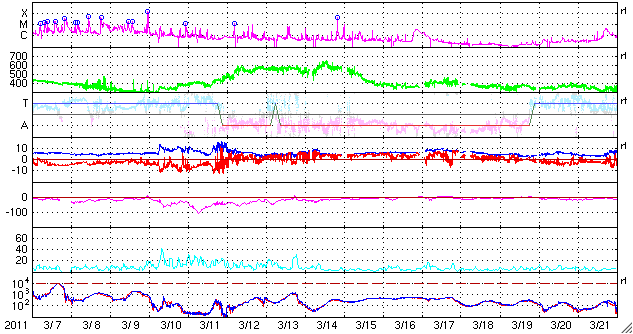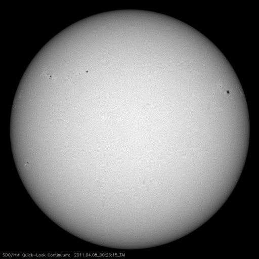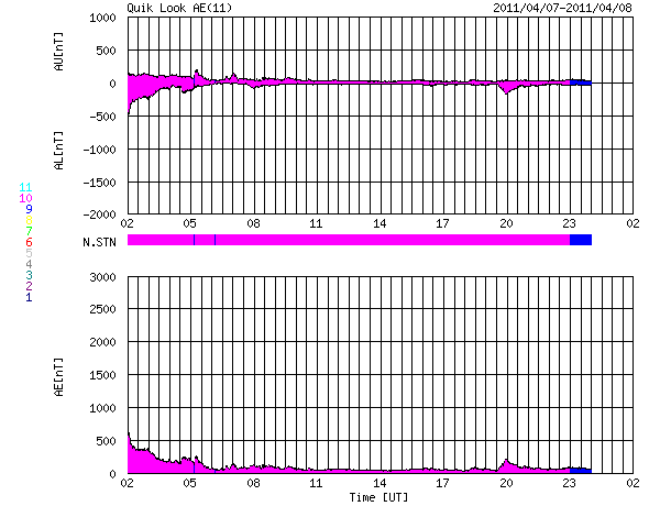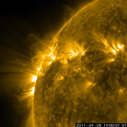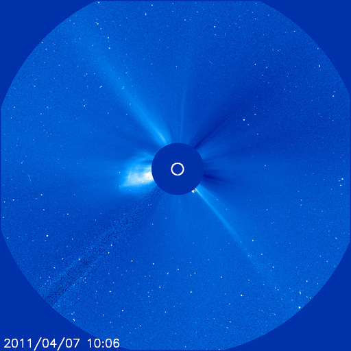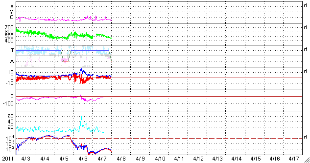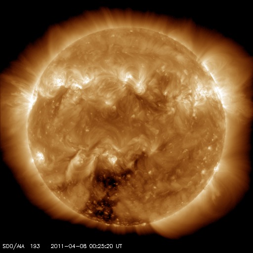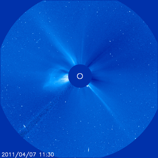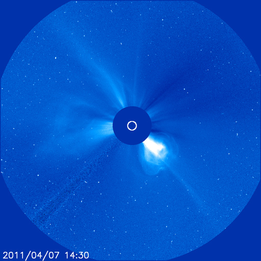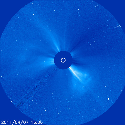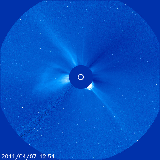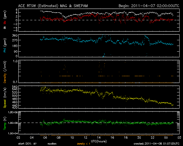 2011/ 4/ 8 10:07 更新 太陽風の擾乱は終わり、オーロラ活動は静穏です。 担当 篠原 太陽では、C1〜2の小規模フレアが3回ほど発生しています。 あまり活動的ではありません。 黒点は、北半球の西の端(右端)から、1183、1184、1185、1186黒点群と、 東端(左端)にかけて4つ並んでいます。 この東側の領域で、ループ状の明るいコロナの変動がとても美しく見えています。 SDOのAIA171による、1日半にわたる動画をご覧ください。 黒点は、南東部(左下)にも新しく出現しています。 1187黒点群です。 また、SOHO LASCO C3カメラで、 CME(太陽ガスの放出現象)が2つ観測されています。 右へ飛びだしているCMEは、太陽の裏側の現象です。 左へ飛びだしているCMEも、ほぼ真横で発生しているので、 地球への影響はないでしょう。 太陽風は、昨日いっぱい500km/秒台を保ち、 その後低下して、現在は450km/秒と高速状態は終わりつつあります。 磁場強度も、3〜4nTと弱めになっています。 磁気圏のオーロラ活動も、激しかったのは昨日のニュースの頃までで、 以降は磁場が北寄りになったため、AE指数はほとんど変動していません。 太陽風は速度も下がったので、磁気圏はしばらく穏やかになるでしょう。 SDO AIA193によると、太陽のコロナには、 南半球側に南極から伸びるコロナホールが見えています。 先頭がちょうど太陽の中心線を越えたところで、 3日後にどのくらいの影響がやって来るか、 緯度が高めなので、影響の度合いが注目されます。 放射線帯の高エネルギー電子は、下がったままでほとんど上昇していません。 太陽風の乱れも終わり、今回はこのまま低いレベルに留まりそうです。 SDO衛星のAIA171カメラによる、太陽東側のコロナループの変動。 (c) SDO (NASA)、動画加工 : 宇宙天気ニュース ![]() SOHO衛星 LASCO C3カメラの映像 (c) SOHO (ESA & NASA)