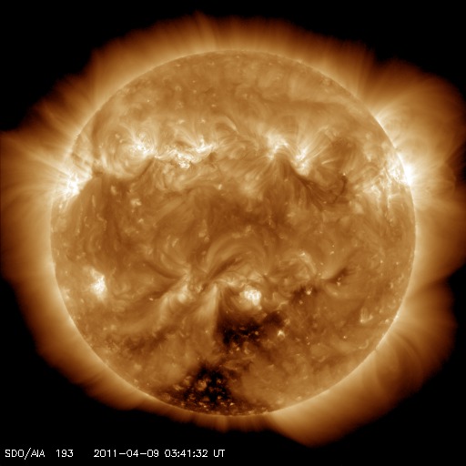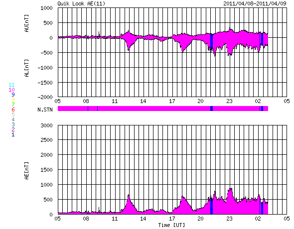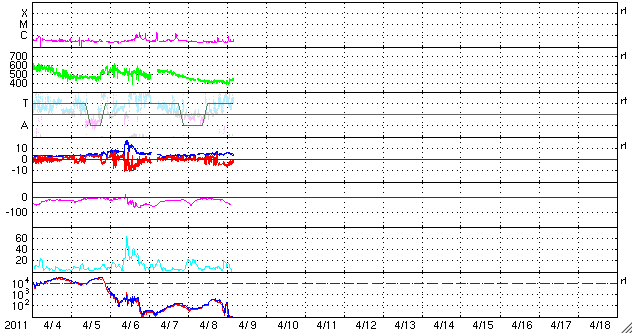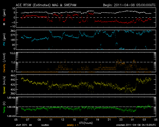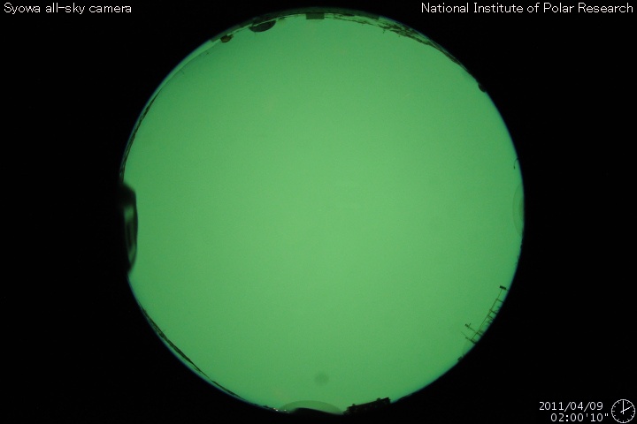 2011/ 4/ 9 13:16 更新 太陽風は平均的な状態ですが、南向き磁場のためにオーロラがやや活発化しています。 担当 篠原 太陽風の速度(ACEの図の黄色線)は、420〜440km/秒と、 昨日のニュース以降、平均的な速さで安定してます。 磁場強度(白線)も、5nTと平均的な強さです。 ただ、ACEの図の後半より、 磁場の南北成分が南に偏る(赤線のグラフがマイナスに偏る)ようになり、 それとともに磁気圏のオーロラ活動が強まっています。 AE指数を見ると、500nTから、強いもので800nTに達する変化が観測されています。 その様子は、昭和基地の全天カメラでも見ることができますが、 今日は曇天のため、空一面がぼんやり光って見えるだけです(一枚を掲載します)。 SDO衛星のAIA193を見ると、 太陽の南半球の大きなコロナホールは、西側へ移動しています。 ここからの影響は、明後日くらいにやって来るかもしれません。 放射線帯の高エネルギー電子は、低いレベルにあります。 太陽のフレア活動も、この1日はCクラスのフレアもなく、穏やかです。 黒点は、南半球の中央少し西よりに1188黒点群、 北半球の中央少し左(1185群の右)に1189黒点群が出現した様です。 どちらも小さな黒点群で、写真を見てもはっきり分かりませんが、 どんどん新しい群が発生します。 南極の昭和基地の全天カメラ画像。雲越しにオーロラの光が見えています。 (c) 国立極地研究所 ![]() SDO衛星のAIA193カメラによる太陽コロナの様子 (c) SDO (NASA) ![]() SDO衛星による太陽の可視光写真。マウスの矢印を写真に重ねると、黒点番号付きの写真に切り替わります。 (c) SDO (NASA) ![]() ACEが観測した太陽風の磁場(1番上の枠、白線は全体の強度、赤線は南北成分) および、太陽風の密度(3番目の橙線)、速度(4番目の黄線) (c) NOAA/SWPC ![]() リアルタイムAE指数 下段のAEグラフの値が高くなると、オーロラ活動が活発化しています。 (c) 京都大学, NICT ![]() 27日の太陽周期に合わせたデータプロット 太陽が同じ面を地球に向けていた27日前の変化から、今後を予想することができます。 (c) 作図:宇宙天気ニュース