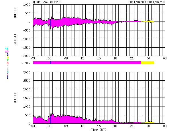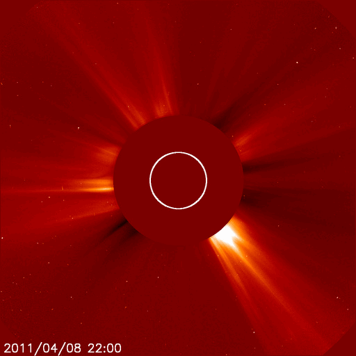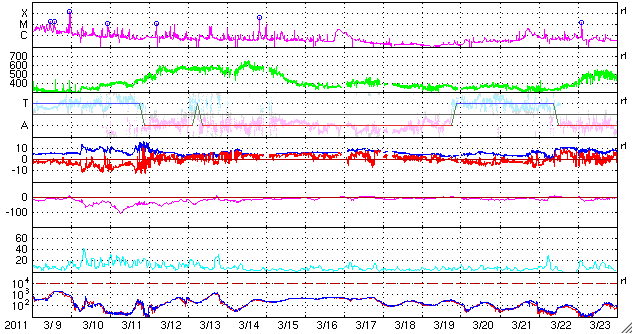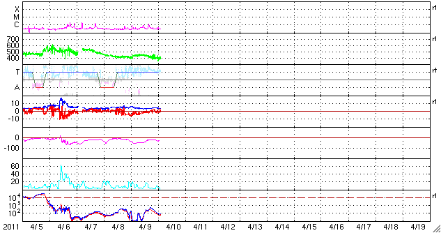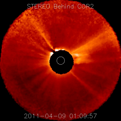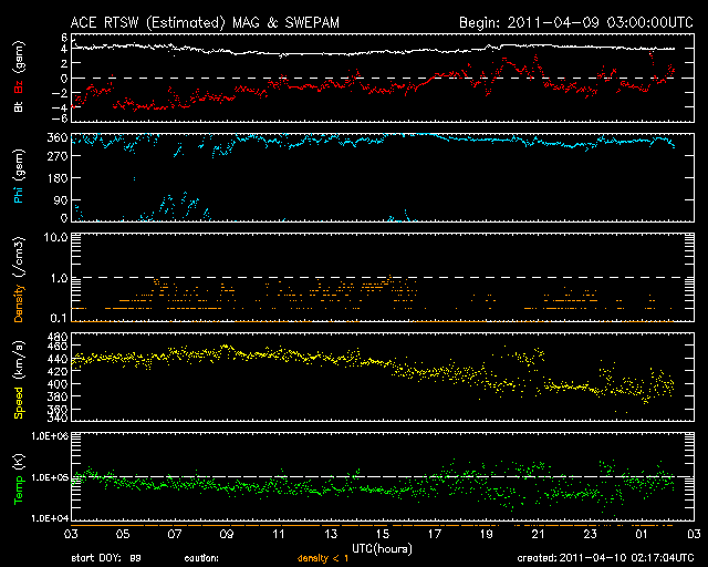 2011/ 4/10 11:18 更新 太陽、太陽風ともに穏やかです。これからコロナホールの影響が始まるかもしれません。 担当 篠原 太陽は、小規模の活動は見られますが、 全体としては落ち着いています。 この1日は、10日0時(世界時9日15時)に、 西の端近くの1184黒点群でC1.3の小規模フレアが発生した程度です。 SOHOのLASCOカメラによると、昨日の朝に、太陽の北東部(左上)から、 弱いCME(太陽ガスの放出現象)が噴き出しています。 LASCO C2の動画を掲載します。 淡いガスが、太陽の左上側に広がる様子を見ることができます。 また、STEREO BehindのCOR2によるCMEの動画も掲載します。 この衛星から見ると、地球は写真の右側です。 地球から見ると、発生地点はやや斜め上です。 また、あまり激しい噴出でもないので、影響はやって来ても限定的でしょう。 ただし、太陽風の速度はあまり上がらなくても、 磁場の強まりが運ばれてくれば、 オーロラが激しく発生する可能性は高まります。 13日頃に注目してください。 太陽風は、少し速度を下げましたが、380km/秒と平均的な速さです。 磁場の南北成分の南寄りの傾向は終わり、 それとともに磁気圏の変動は小さくなっています。 今後、太陽の南半球に広がるコロナホールの影響がやって来る可能性があります。 SDO衛星AIA193によると、コロナホールはだいぶ西側(右側)に動いています。 コロナホールの広がりが高緯度側に偏っているため、 どの程度の影響が太陽風に見られるのか、予想しづらいところです。 今後、太陽風の磁場強度が強まるなどすると、 高速風も始まる可能性があります。 SOHO LASCO C2が撮影した、北東方向へ噴きだすCME。かなり淡いです。 (c) SOHO (ESA & NASA)、動画加工 : 宇宙天気ニュース ![]() STEREO Behindから見たCME。地球のある右側に噴き出しています。 (c) STEREO (NASA)、動画加工 : 宇宙天気ニュース ![]() SDO衛星のAIA193カメラによる太陽コロナの様子 (c) SDO (NASA) ![]() SDO衛星による太陽の可視光写真。マウスの矢印を写真に重ねると、黒点番号付きの写真に切り替わります。 (c) SDO (NASA) ![]() GOES衛星の太陽X線データ (c) NOAA/SWPC ![]() ACEが観測した太陽風の磁場(1番上の枠、白線は全体の強度、赤線は南北成分) および、太陽風の密度(3番目の橙線)、速度(4番目の黄線) (c) NOAA/SWPC ![]() リアルタイムAE指数 下段のAEグラフの値が高くなると、オーロラ活動が活発化しています。 (c) 京都大学, NICT ![]() 27日の太陽周期に合わせたデータプロット 太陽が同じ面を地球に向けていた27日前の変化から、今後を予想することができます。 (c) 作図:宇宙天気ニュース