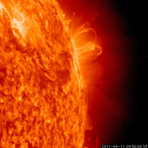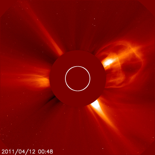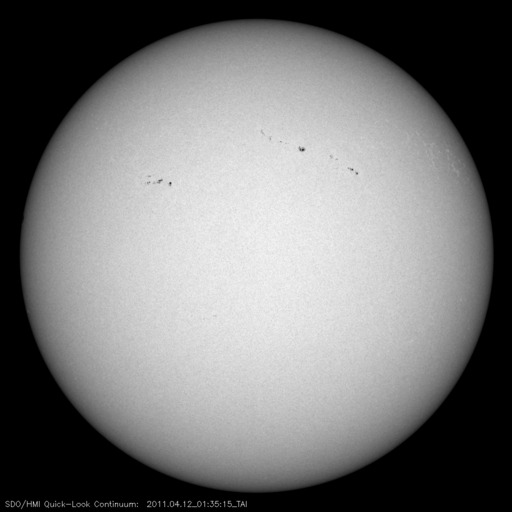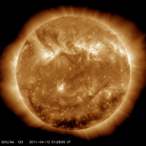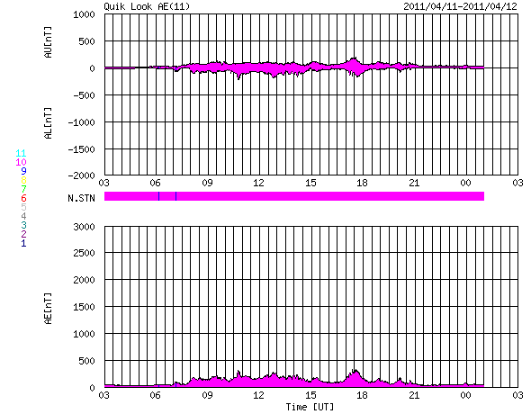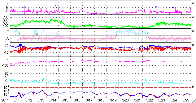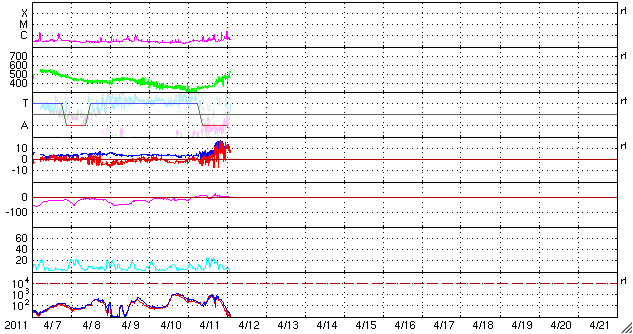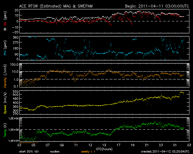 2011/ 4/12 11:21 更新 コロナホールによる高速の太陽風が始まりました。現在の磁気圏は静穏です。 担当 篠原 太陽の東と西で活動が見られています。 東端(左端)の向こう側には、活発に活動している領域があり、 GOESのX線で、C1前後の変動を起こしています。 実際には、これよりも規模の大きい現象と考えられます。 こちら側に回ってきた後の活動に注目してください。 また、西端(右端)近くでは、大きなフィラメントの噴出が発生しています。 SDO AIA304の動画を掲載します。 これに伴って、CMEが発生しています。 右側に向かっているので、地球への影響はありません。 また、太陽の中央やや左側には、1190黒点群が発生しています。 C1程度のフレアを起こしており、今後の発達に注目してください。 太陽風は、予想よりも遅れましたが、コロナホールの影響がやって来たようです。 昨夜、12日1時(世界時11日16時)頃から磁場強度が10〜15nTに強まり、 速度もゆっくりと上昇を始めました。 昨日までは300〜350km/秒の低速風でしたが、 現在は530km/秒くらいの速さに上昇しています。 一方、磁場強度の強まりは一段落ついて、8nTくらいに下がっています。 それでも、まだ平均よりもやや強い状態です。 地球の磁気圏への影響を決める、太陽風磁場の南北成分は、 磁場強度の強まり以降、ほぼ北を向き続けています。 このため、速度は上昇していますが、磁気圏への影響は小さく、 AE指数はほとんど変化していません。 今後もこの傾向が続くと、 高速風は来たものの、磁気圏は静穏な状態が続くでしょう。 しかし、今後磁場の方向が南寄りに切り替われば、 オーロラも活発に発生するようになります。 今回の高速太陽風は、あまり長く続かないと思います。 2〜3日程度ではないでしょうか。 SDO衛星のAIA304カメラによる、太陽西端で発生したフィラメントの噴出。 (c) SDO (NASA)、動画加工 : 宇宙天気ニュース ![]() 上の噴出現象によって発生したCME。SOHO LASCO C2による。 (c) SOHO (ESA & NASA) ![]() SDO衛星のAIA193カメラによる太陽コロナの様子 (c) SDO (NASA) ![]() SDO衛星による太陽の可視光写真。マウスの矢印を写真に重ねると、黒点番号付きの写真に切り替わります。 (c) SDO (NASA) ![]() GOES衛星の太陽X線データ (c) NOAA/SWPC ![]() ACEが観測した太陽風の磁場(1番上の枠、白線は全体の強度、赤線は南北成分) および、太陽風の密度(3番目の橙線)、速度(4番目の黄線) (c) NOAA/SWPC ![]() リアルタイムAE指数 下段のAEグラフの値が高くなると、オーロラ活動が活発化しています。 (c) 京都大学, NICT ![]() 27日の太陽周期に合わせたデータプロット 太陽が同じ面を地球に向けていた27日前の変化から、今後を予想することができます。 (c) 作図:宇宙天気ニュース