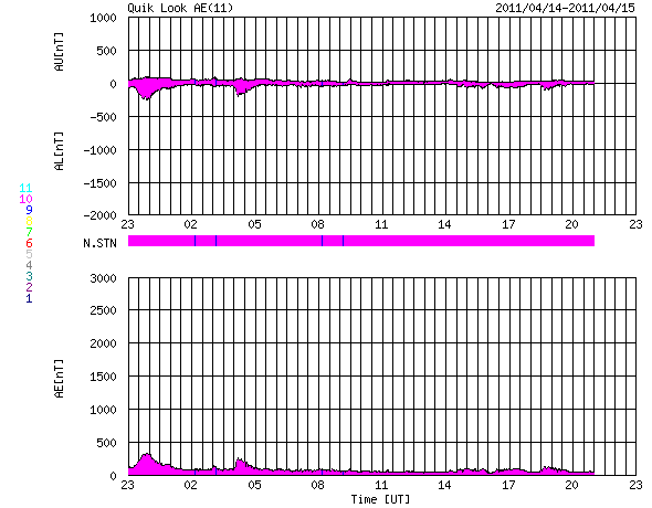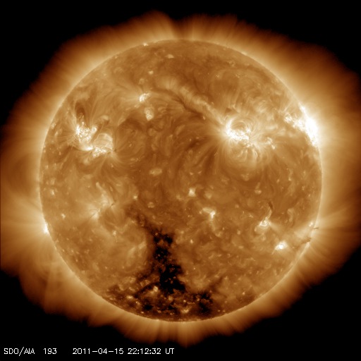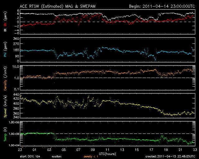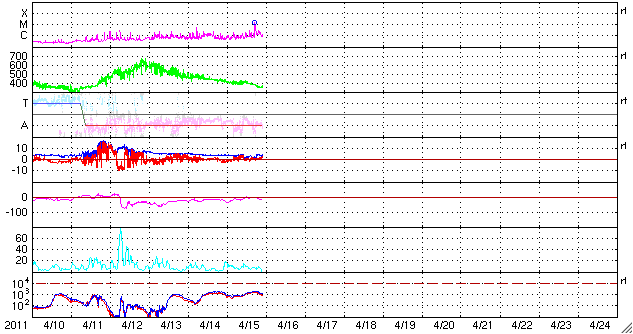 2011/ 4/16 07:48 更新 M1.3の中規模フレアが発生しました。太陽風は低速になり、磁気圏は静穏です。 担当 篠原 太陽の北半球西寄り(右寄り)の1190黒点群と、東端(左端)近くの1193黒点群が、 どちらも大きくなっているようです。 特に1190黒点群は、大きなかたまりになっています。 この1190群でM1.3の中規模フレアが発生しました。 16日2時(世界時15日17時)です。 この2つの黒点群は、この他にもC1〜3程度の小規模フレアを何度も起こしています。 今後も、中小規模のフレアが続きそうです。 また、15日8時(世界時14日23時)頃に、 太陽の南東(左下)で、フィラメントの噴出が起きました。 SOHO LASCOカメラでは、左側に淡いCME(太陽ガスの放出現象)の広がりが見えています。 4日後の19日頃に、地球へも多少影響が及ぶかもしれません。 太陽風の速度は、360km/秒に下がり、低速風となっています。 磁場強度も、2〜4nTと弱めの値で推移しています。 磁気圏も静穏で、AE指数はほとんど変化していません。 これから3日程度は静かな太陽風が続くでしょう。 その後、19日くらいから、 太陽の南半球に見えるコロナホールの影響が地球にやって来そうです。 このコロナホールは(SDO AIA193参照)、 南極から南半球の低緯度域にかけてまっすぐ延びています。 緯度が高めの領域にあるため、地球への影響はやや及びにくい状況ですが、 12〜13日にかけてやって来た高速風の時も、同じようなコロナホールの広がりで、 この時は最高で650km/秒に達する太陽風がやって来たので、 今回も注目する必要はありそうです。 SDO衛星のAIA193カメラによる太陽コロナの様子 (c) SDO (NASA) ![]() SDO衛星による太陽の可視光写真。マウスの矢印を写真に重ねると、黒点番号付きの写真に切り替わります。 (c) SDO (NASA) ![]() GOES衛星の太陽X線データ (c) NOAA/SWPC ![]() ACEが観測した太陽風の磁場(1番上の枠、白線は全体の強度、赤線は南北成分) および、太陽風の密度(3番目の橙線)、速度(4番目の黄線) (c) NOAA/SWPC ![]() リアルタイムAE指数 下段のAEグラフの値が高くなると、オーロラ活動が活発化しています。 (c) 京都大学, NICT ![]() 27日の太陽周期に合わせたデータプロット 太陽が同じ面を地球に向けていた27日前の変化から、今後を予想することができます。 (c) 作図:宇宙天気ニュース