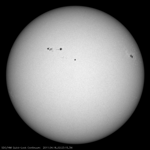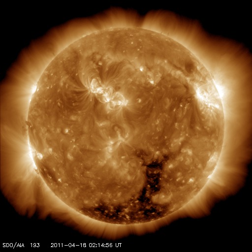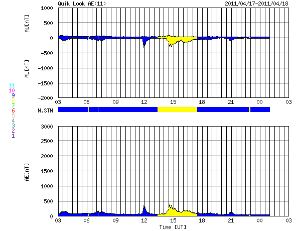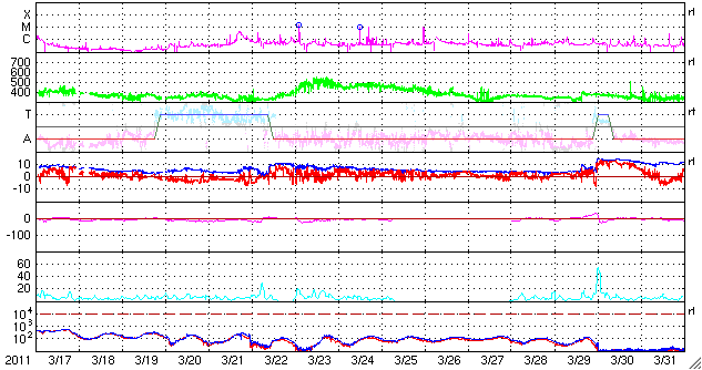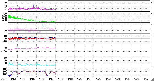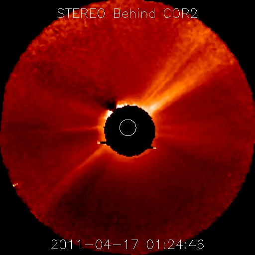 2011/ 4/18 11:53 更新 太陽風は低速で、磁気圏も穏やかです。今後、高速風が始まる可能性があります。 担当 篠原 太陽の裏側でフレアが発生して、CME(太陽ガスの放出現象)も噴き出しています。 STEREO BehindのCOR2カメラによる動画を掲載します。 地球は、この写真の右方向にあります。 初めに、フィラメントの噴出によるゆっくりとしたCMEが右上に飛び、 続いて、フレアに続く勢いの良いCMEが左に向かって噴出しています。 左に向かっているCMEは(裏側の現象なので)、もちろん地球への影響はありませんが、 右の斜め上に飛び出しているものも、方向がだいぶ逸れているので、 地球への影響は小さいでしょう。 太陽のフレア活動は、落ち着いています。 この1日では、C1の小規模フレアが3回発生した程度で、 GOES衛星のX線のグラフも勢いを失いつつあります。 今後も、あまり大きなフレアは起きないでしょう。 太陽風は、320〜330km/秒の遅い風で安定しています。 磁場強度も2〜4nTに弱まったままです。 磁気圏も静穏で、AE指数はほとんど変化がありません。 コロナホールは、太陽の西側に回り、 地球への影響開始が近づいています。 今日から明日にかけて、太陽風磁場の強まり、 そして速度の上昇がやって来る可能性があります。 STEREO Behindによる、太陽の裏側(左側)へ噴き出したCME。 (c) STEREO (NASA) ![]() SDO衛星のAIA193カメラによる太陽コロナの様子 (c) SDO (NASA) ![]() SDO衛星による太陽の可視光写真。マウスの矢印を写真に重ねると、黒点番号付きの写真に切り替わります。 (c) SDO (NASA) ![]() GOES衛星の太陽X線データ (c) NOAA/SWPC ![]() ACEが観測した太陽風の磁場(1番上の枠、白線は全体の強度、赤線は南北成分) および、太陽風の密度(3番目の橙線)、速度(4番目の黄線) (c) NOAA/SWPC ![]() リアルタイムAE指数 下段のAEグラフの値が高くなると、オーロラ活動が活発化しています。 (c) 京都大学, NICT ![]() 27日の太陽周期に合わせたデータプロット 太陽が同じ面を地球に向けていた27日前の変化から、今後を予想することができます。 (c) 作図:宇宙天気ニュース