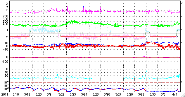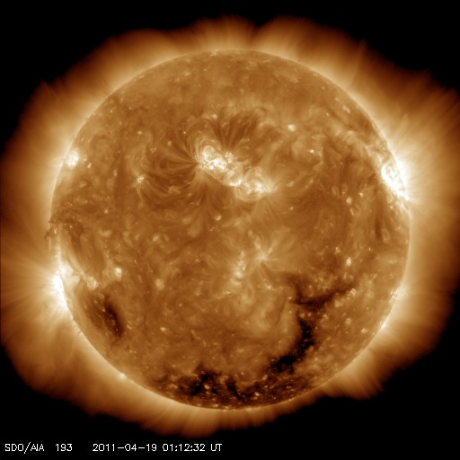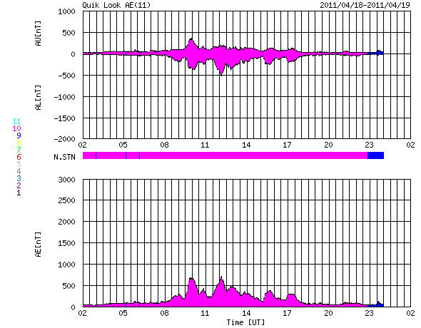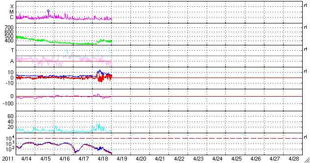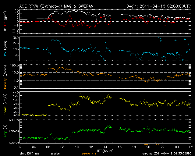 2011/ 4/19 10:53 更新 CMEの影響で、太陽風に小規模の乱れが発生しています。太陽は穏やかです。 担当 篠原 ACE衛星の観測によると、18日15時(世界時18日6時)に、 太陽風の速度や密度の急な変化が発生しています。 変化としては小幅で、速度は320km/秒から380km/秒へ変化した程度です。 その後、磁場強度は15nT近くに強まり、 速度は最高で420km/秒くらいまで高まっています。 16日のニュースでお知らせした、CMEの影響がやって来たのではないでしょうか。 磁場の南北成分が-5nT程度の南向きになり、 AE指数で700nTほどの中規模の変動が発生しています。 現在の太陽風は、磁場強度は5nTを割る程度に弱まり、 速度は380km/秒と平均的な速さです。 地球は、そのままコロナホール起源の高速風の影響に入る可能性もあり、 この後の太陽風の変化に注目してください。 SDO衛星のAIA193を見ると、南半球のコロナホールは、 西側(右側)にすっかり移動しています。 地球に高速風が到達するタイミングを測る目安の位置です。 太陽は、北半球の中心に見える1193黒点群で C1前後の小規模のフレアが起きているだけで、 比較的穏やかに推移しています。 次の注目点は、南東(左下)の端からこちら側に回ってくる、 新しい活動領域の様子でしょう。 SDO衛星のAIA193カメラによる太陽コロナの様子 (c) SDO (NASA) ![]() SDO衛星による太陽の可視光写真。マウスの矢印を写真に重ねると、黒点番号付きの写真に切り替わります。 (c) SDO (NASA) ![]() ACEが観測した太陽風の磁場(1番上の枠、白線は全体の強度、赤線は南北成分) および、太陽風の密度(3番目の橙線)、速度(4番目の黄線) (c) NOAA/SWPC ![]() リアルタイムAE指数 下段のAEグラフの値が高くなると、オーロラ活動が活発化しています。 (c) 京都大学, NICT ![]() 27日の太陽周期に合わせたデータプロット 太陽が同じ面を地球に向けていた27日前の変化から、今後を予想することができます。 (c) 作図:宇宙天気ニュース