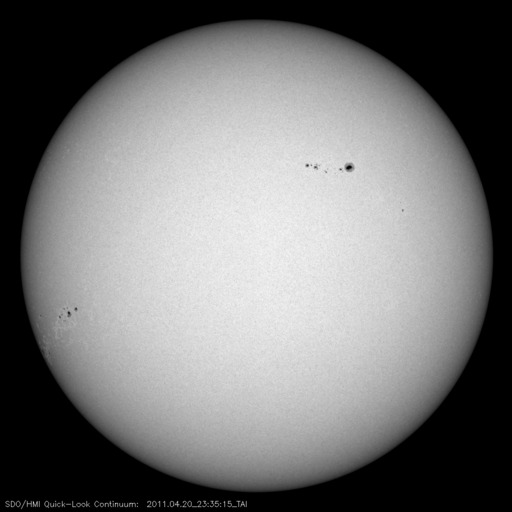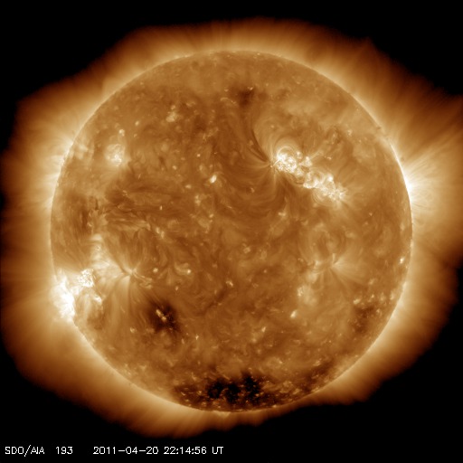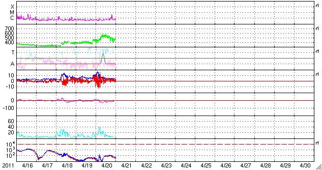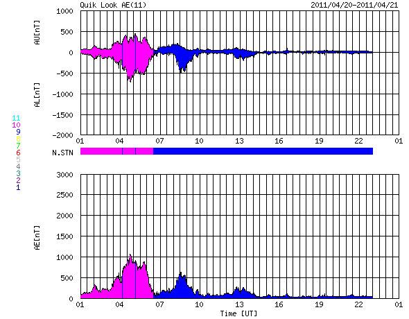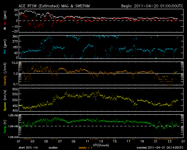 2011/ 4/21 09:14 更新 500km/秒台の高速太陽風が続いています。一時的にオーロラ活動も激しくなりました。 担当 篠原 高速に変わっていた太陽風の速度は、 昨日の午後に550km/秒まで高まりました。 磁場強度は、その頃までに5nT程度に減少し、 以降、更に弱まって現在は2〜3nTほどです。 一方、550km/秒に上昇した速度も、今日に入るとやや低下して、 現在は450〜500km/秒付近で推移しています。 まだ高速状態を保っていますが、この後は、あまり長く続かないと思われます。 この高速風が通り過ぎると、太陽風はまた低速状態に戻るでしょう。 磁気圏のオーロラ活動は、 昨日の昼頃に、太陽風磁場の南北成分が-10nTに達する強い南向きになり、 AE指数で2000nTに達する激しい変動を作っています。 その後、磁場は北向きに戻ったため、 オーロラの活動もほとんど見られなくなっています。 放射線帯の高エネルギー電子は、目立った変化はありません。 低いレベルで推移しています。 太陽は、南東(左下)の1195黒点群が一番活動的です。 C1.0、C1.5、C4.0などの小規模フレアを度々起こしています。 こちらも引き続き注意してください。 SDO衛星のAIA193カメラによる太陽コロナの様子 (c) SDO (NASA) ![]() SDO衛星による太陽の可視光写真。マウスの矢印を写真に重ねると、黒点番号付きの写真に切り替わります。 (c) SDO (NASA) ![]() ACEが観測した太陽風の磁場(1番上の枠、白線は全体の強度、赤線は南北成分) および、太陽風の密度(3番目の橙線)、速度(4番目の黄線) (c) NOAA/SWPC ![]() リアルタイムAE指数 下段のAEグラフの値が高くなると、オーロラ活動が活発化しています。 (c) 京都大学, NICT ![]() 27日の太陽周期に合わせたデータプロット 太陽が同じ面を地球に向けていた27日前の変化から、今後を予想することができます。 (c) 作図:宇宙天気ニュース