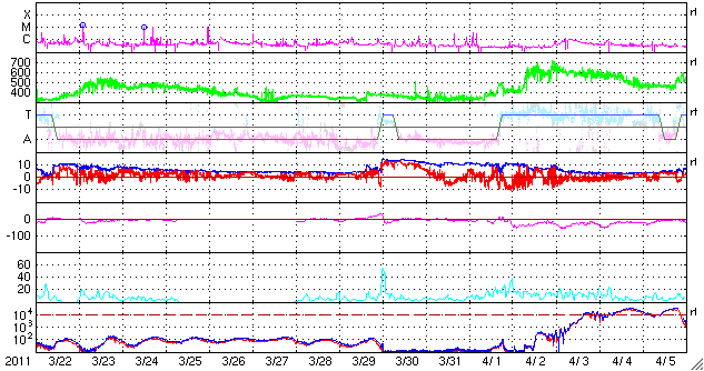 - 2011/ 4/18 11:53 太陽風は低速で、磁気圏も穏やかです。今後、高速風が始まる可能性があります。