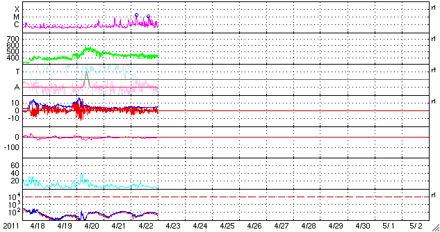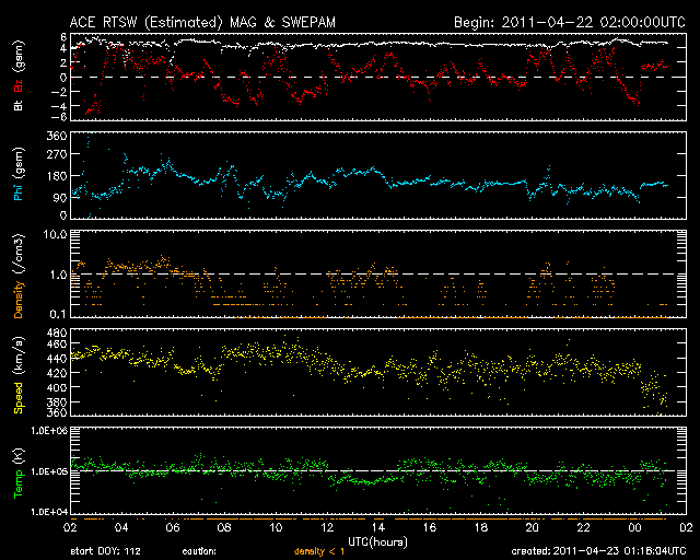 - 2011/ 4/21 09:14 500km/秒台の高速太陽風が続いています。一時的にオーロラ活動も激しくなりました。