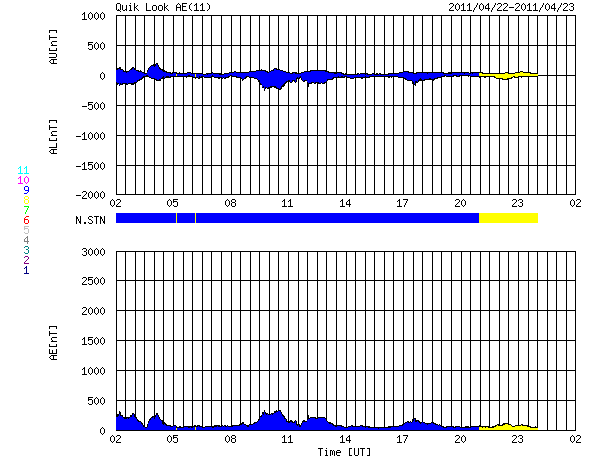 下段のAEグラフの値が高くなると、オーロラ活動が活発化しています。