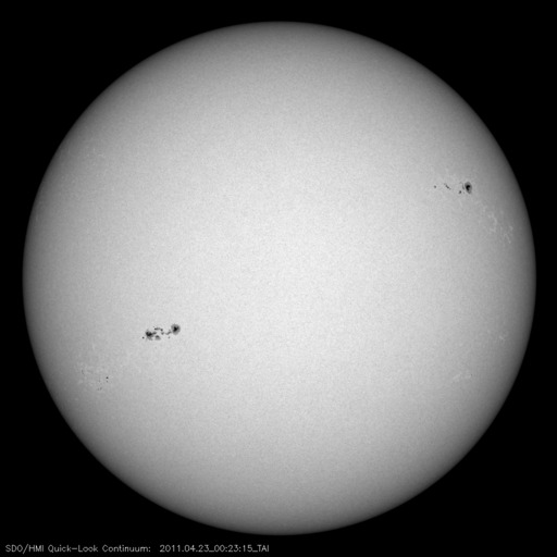 SDO衛星による太陽の可視光写真。マウスの矢印を写真に重ねると、黒点番号付きの写真に切り替わります。