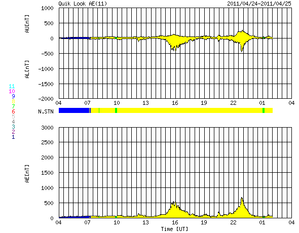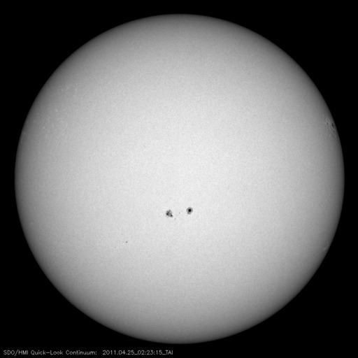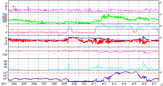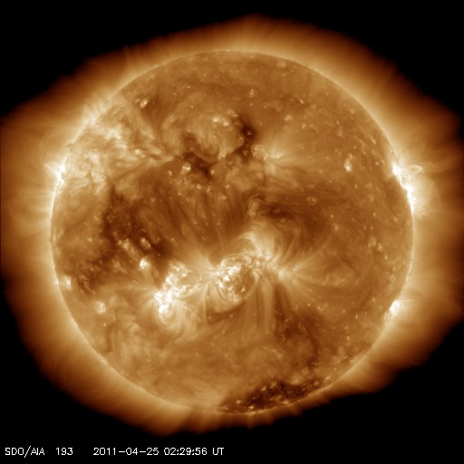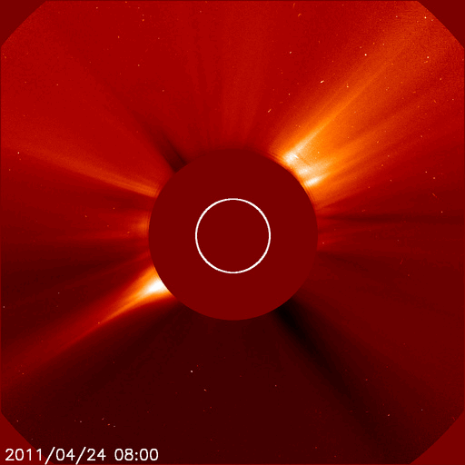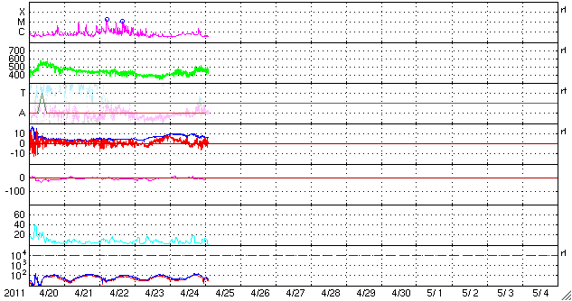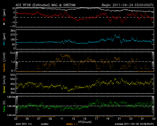 2011/ 4/25 12:00 更新 太陽のフレア活動は穏やかです。太陽風はやや高速ですが、磁気圏は概ね静穏です。 担当 篠原 1195黒点群は、すっかり穏やかになっています。 昨日から今日にかけては、目立ったフレア活動を起こしていません。 GOES衛星のX線グラフでは、 25日4時(世界時24日19時)にC2.4の小規模フレアが観測されていますが、 これは、太陽の東端の向こう側で発生したフレアによるものです。 このフレアによるものを含めて、 太陽の左右ににぎやかにCME(太陽ガスの放出現象)が飛び出しています。 SOHO LASCO C2による動画を掲載します。 地球からは横の方向に飛びだしているので、影響はありません。 太陽の東端でフレアが発生したので、 今後、こちら側に回ってきた時にどの様な領域になっているか注目されます。 太陽風は、磁場強度の強まりは終わり、現在は5nTに戻っています。 速度は若干上がって、昨日のニュースの後は450km/秒とやや高めの速度が続いています。 磁気圏では、ある程度のオーロラ活動が見られていて、 AE指数には、500〜600nTほどの中規模の活動が観測されています。 しかし、全体的には穏やかに推移していると言えるでしょう。 この後の太陽風ですが、SDO衛星のAIA193の太陽コロナ写真を見ると、 太陽の北半球側には、コロナホールと思われる薄暗い部分がところどころあります。 これらの影響がどの程度地球に及ぶかです。 東端に近いコロナホールからは、ある程度強い影響がやって来るかもしれません。 5日程度先のことでしょう。 SOHO LASCO C2が撮影した、太陽から左右に噴きだすCME。 (c) SOHO (ESA & NASA)、動画加工 : 宇宙天気ニュース ![]() SDO衛星のAIA193カメラによる太陽コロナの様子 (c) SDO (NASA) ![]() SDO衛星による太陽の可視光写真。マウスの矢印を写真に重ねると、黒点番号付きの写真に切り替わります。 (c) SDO (NASA) ![]() GOES衛星の太陽X線データ (c) NOAA/SWPC ![]() ACEが観測した太陽風の磁場(1番上の枠、白線は全体の強度、赤線は南北成分) および、太陽風の密度(3番目の橙線)、速度(4番目の黄線) (c) NOAA/SWPC ![]() リアルタイムAE指数 下段のAEグラフの値が高くなると、オーロラ活動が活発化しています。 (c) 京都大学, NICT ![]() 27日の太陽周期に合わせたデータプロット 太陽が同じ面を地球に向けていた27日前の変化から、今後を予想することができます。 (c) 作図:宇宙天気ニュース