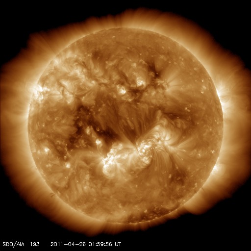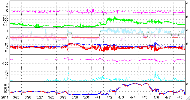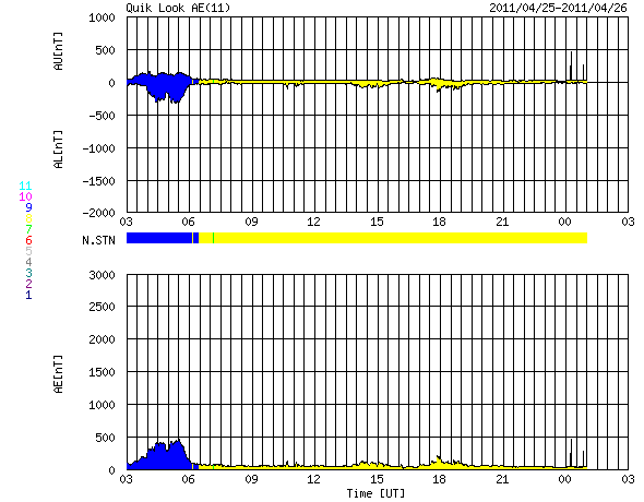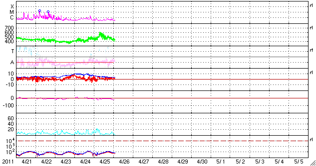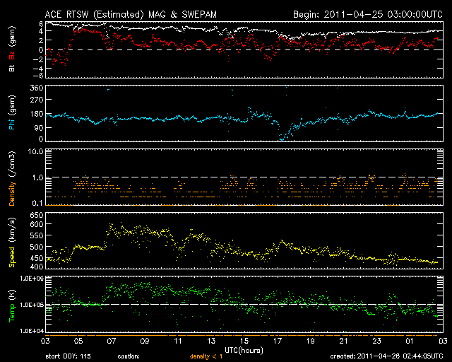 2011/ 4/26 11:45 更新 太陽風は平均的な速度に戻り、磁気圏も静かです。 担当 篠原 全体的に穏やかな宇宙天気です。 太陽風の速度は、昨日の午後に600km/秒近くにまで高まりましたが、 数時間ほどで下がり始め、現在は430km/秒と平均的な速度に戻っています。 磁場強度も4nTと穏やかです。 磁気圏のオーロラ活動も穏やかです。 AE指数のグラフは、最初のひと山だけで、以降はほとんど変化していません。 太陽風の速度は強まったものの、 磁場の南北成分が北寄りに推移していたためでしょう。 SDO AIA193を見ると、 太陽の中心付近には淡いコロナホールらしき領域が広がり、 今後はどれだけの影響が地球までやって来るかでしょう。 27日周期の図を見ると、前周期は、 4月2日から4月7日まで500km/秒を超える高速の太陽風が続きました。 最高速度は650km/秒にも達しています。 現在の太陽コロナの様子は、この時と良く似ています。 従って、今回もある程度まとまった規模の高速風がやって来るかもしれません。 しばらく注目する必要があるでしょう。 太陽では、1195黒点群はまた縮小してしまったように見えます。 一方、北半球側に小さな新しい黒点が発生しています。 X線のグラフでは、フレアの変化も小さなものばかりで、 太陽の活動は落ち着いています。 それでも、SDO AIA193の動画を見ると、 太陽のあちこちで規模は小さいですが、活動は発生しています。 次に活動を強めるのはどの領域なのか、注目してください。 SDO衛星のAIA193カメラによる太陽コロナの様子 (c) SDO (NASA) ![]() SDO衛星による太陽の可視光写真。マウスの矢印を写真に重ねると、黒点番号付きの写真に切り替わります。 (c) SDO (NASA) ![]() ACEが観測した太陽風の磁場(1番上の枠、白線は全体の強度、赤線は南北成分) および、太陽風の密度(3番目の橙線)、速度(4番目の黄線) (c) NOAA/SWPC ![]() リアルタイムAE指数 下段のAEグラフの値が高くなると、オーロラ活動が活発化しています。 (c) 京都大学, NICT ![]() 27日の太陽周期に合わせたデータプロット 太陽が同じ面を地球に向けていた27日前の変化から、今後を予想することができます。 (c) 作図:宇宙天気ニュース