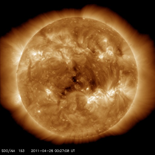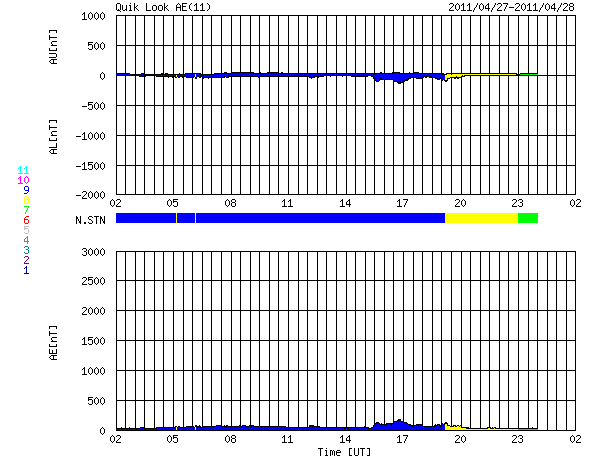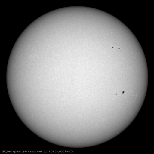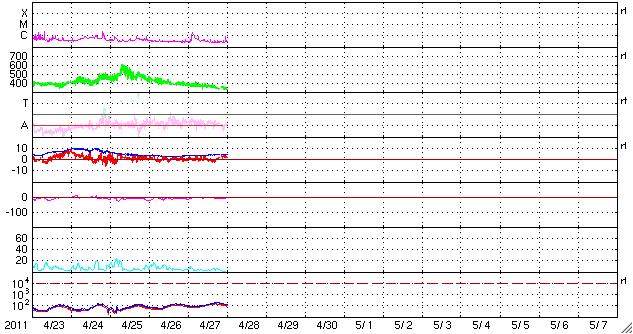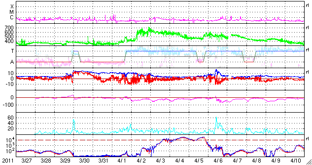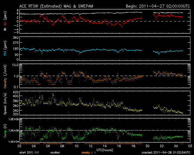 2011/ 4/28 10:02 更新 太陽のフレア活動は穏やかです。太陽風も低速で穏やかです。 担当 篠原 4月20日に、アクセス累計400万件に達しました。 ご愛読ありがとうございます。 経過を上記の記事で報告します。 太陽は、北西(右上)の1199黒点群が左右2つに分かれています。 南西(右下)の1195黒点群と南北の半球でそっくりな姿になっています。 太陽は昨日のC2.0以降は目立った活動はなく、穏やかな状態です。 太陽風も穏やかです。 速度は340km/秒に下がり、すっかり低速風です。 磁場強度は4nTと平均的な状態を保っています。 このため、磁気圏のオーロラ活動も穏やかで、 オーロラの活動に伴って発生する磁場変動を記録するAE指数のグラフは、 ほとんど変化していません。 SDO AIA193の太陽コロナ写真によると、 太陽中心付近のコロナホールは、次第に西側に移動し、 地球へ影響が及び始める目安の位置に近づいています。 (太陽の西側(右側)に半分くらい進んだあたりを目安にしています) 前周期の太陽風を参考にすると、 明日に相当する4月2日から高速状態に変わっているので、 今後の太陽風の変化に注目してください。 SDO衛星のAIA193カメラによる太陽コロナの様子 (c) SDO (NASA) ![]() SDO衛星による太陽の可視光写真。マウスの矢印を写真に重ねると、黒点番号付きの写真に切り替わります。 (c) SDO (NASA) ![]() GOES衛星の太陽X線データ (c) NOAA/SWPC ![]() ACEが観測した太陽風の磁場(1番上の枠、白線は全体の強度、赤線は南北成分) および、太陽風の密度(3番目の橙線)、速度(4番目の黄線) (c) NOAA/SWPC ![]() リアルタイムAE指数 下段のAEグラフの値が高くなると、オーロラ活動が活発化しています。 (c) 京都大学, NICT ![]() 27日の太陽周期に合わせたデータプロット 太陽が同じ面を地球に向けていた27日前の変化から、今後を予想することができます。 (c) 作図:宇宙天気ニュース