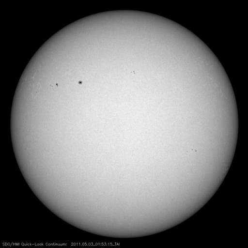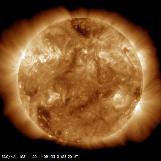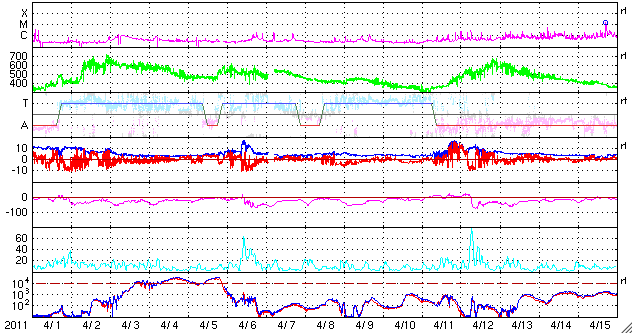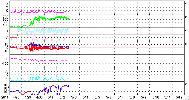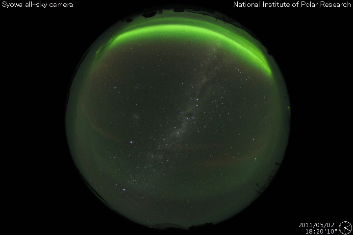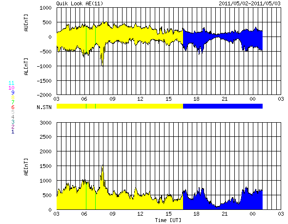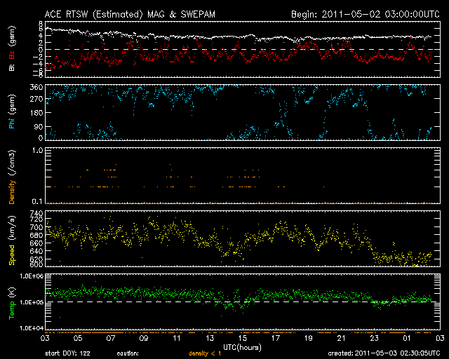 2011/ 5/ 3 11:30 更新 600km/秒台後半の高速太陽風が続き、活発にオーロラを起こしました。高速風は下がり始めた様です。 担当 篠原 高い速度の太陽風が続き、活発なオーロラ活動も続いています。 昨日の太陽風は、ずっと650〜700km/秒のかなり高い速度が続きました。 今朝になって一段下がりましたが、620km/秒に下がった程度で、 依然高い速度を保っています。 このため、オーロラ活動も活発に発生しています。 今日のAE指数の図は、500nTを超える変化が連続していて、 最高は1500nTにまで達しています。 磁場強度は、昨日のニュース以降4nTに下がり、 南向き磁場の振れ幅も次第に小さくなっているのですが、 速度がかなり高まっているため、磁気圏へ及ぶ影響は大きかったのでしょう。 イエローナイフの大塚様より、 現地2日1時半(世界時2日7時半)頃のオーロラの写真が届きました。 美しいオーロラのカーテンをご覧ください。 また、昭和基地でも晴れ間に素晴らしいオーロラの爆発が見えていたようです。 40分間の動画を掲載します。 イエローナイフの写真の半日後のオーロラです。 太陽風の磁場強度がいくらか弱まってきたことから、 高速風領域は後半に入ってきたのだと思います。 今後、速度は次第に低下していくでしょう。 まだ、速度は600km/秒台の高い状態にあるので、 完全に下がるには2〜3日くらいかかるかもしれません。 放射線帯の高エネルギー電子は、特に増加はせず、 今日もぎりぎりで10,000に達した程度でした。 太陽は、フレア活動を起こしていた黒点群が西に没して、 おとなしくなっています。 黒点群は、小さいながらもいくつも見えています。 南半球の西側に1200黒点群、 北半球の東寄りに、1203、1204、1205と並び、 番号はまだありませんが、中央付近にももうひとつ黒点群が見えています。 イエローナイフの大塚氏より、5月2日に発生したオーロラの写真が送られてきました。 (c) YOSHI OTSUKA ![]() 同じく5月2日(上の写真の半日後)に南極の昭和基地に現われたオーロラ。 (c) 国立極地研究所、動画加工 : 宇宙天気ニュース ![]() SDO衛星のAIA193カメラによる太陽コロナの様子 (c) SDO (NASA) ![]() SDO衛星による太陽の可視光写真。マウスの矢印を写真に重ねると、黒点番号付きの写真に切り替わります。 (c) SDO (NASA) ![]() ACEが観測した太陽風の磁場(1番上の枠、白線は全体の強度、赤線は南北成分) および、太陽風の密度(3番目の橙線)、速度(4番目の黄線) (c) NOAA/SWPC ![]() リアルタイムAE指数 下段のAEグラフの値が高くなると、オーロラ活動が活発化しています。 (c) 京都大学, NICT ![]() 27日の太陽周期に合わせたデータプロット 太陽が同じ面を地球に向けていた27日前の変化から、今後を予想することができます。 (c) 作図:宇宙天気ニュース