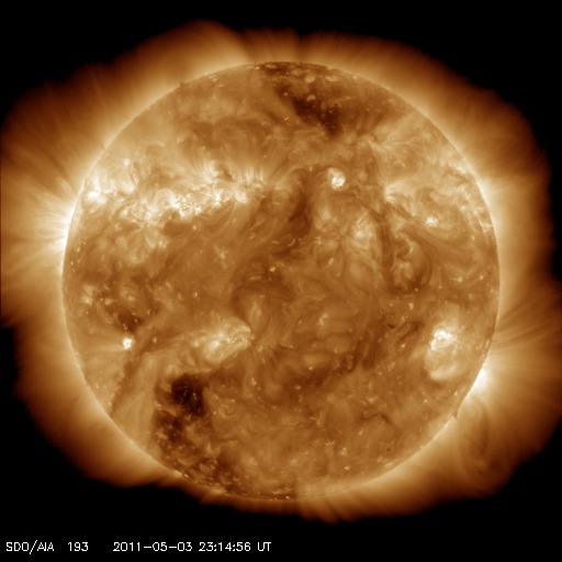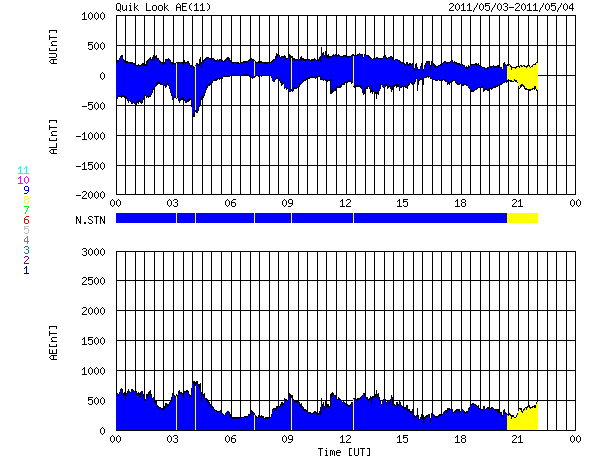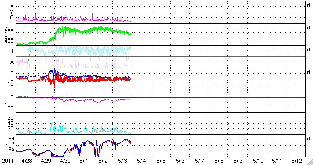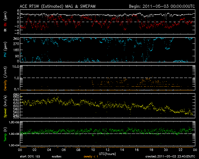 2011/ 5/ 4 08:41 更新 太陽風速度は550km/秒に下がり、高速風は終わりが近付いています。太陽は穏やかです。 担当 篠原 高速の太陽風領域は、終わりが近付いています。 昨日は600km/秒台前半だった太陽風の速度は、現在は550km/秒へ下がっています。 依然、高速状態ですが、この後も速度は次第に下がっていくでしょう。 明日か明後日には、平均的な速度(400km/秒前後)に戻るのではないでしょうか。 磁場強度も、4〜3nTへと更に弱まっています。 このことも、高速風領域の終わりが近いことを示しています。 太陽風磁場の南北成分は、この1日間もやや南寄りに変動しています。 このため、オーロラの活動は現在まで連続的に発生しているのですが、 速度が下がり、磁場強度も弱まっているため、AE指数の振れ幅は小さくなっています。 今日の図では、前半は500nTをやや超えて中規模の変化をしていますが、 後半は300nTと小規模の変化へ弱まっています。 放射線帯の高エネルギー電子は、今日も10,000の警戒レベルを超えています。 今後、太陽風が落ち着くと、放射線帯の減少はゆっくりになります。 しばらく、警戒状態が続く可能性があります。 太陽のフレア活動は、1204黒点群でC1の小規模フレアが発生した程度で、 穏やかになっています。 昨日の記事で書いていた、太陽の中心付近の黒点群は、 1206黒点群と番号が付けられたそうですが、 今日の写真ではほとんど見えなくなっています。 1203、1204、1205群の変動も勢いはなく、太陽の活動は静かに推移しそうです。 SDO衛星のAIA193カメラによる太陽コロナの様子 (c) SDO (NASA) ![]() SDO衛星による太陽の可視光写真。マウスの矢印を写真に重ねると、黒点番号付きの写真に切り替わります。 (c) SDO (NASA) ![]() ACEが観測した太陽風の磁場(1番上の枠、白線は全体の強度、赤線は南北成分) および、太陽風の密度(3番目の橙線)、速度(4番目の黄線) (c) NOAA/SWPC ![]() リアルタイムAE指数 下段のAEグラフの値が高くなると、オーロラ活動が活発化しています。 (c) 京都大学, NICT ![]() 27日の太陽周期に合わせたデータプロット 太陽が同じ面を地球に向けていた27日前の変化から、今後を予想することができます。 (c) 作図:宇宙天気ニュース
