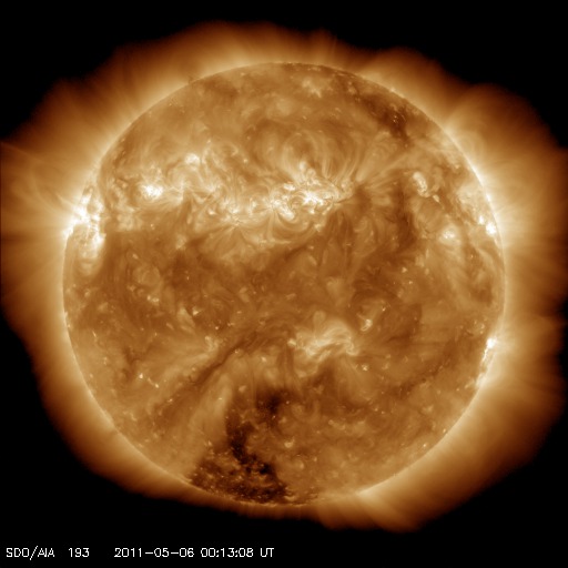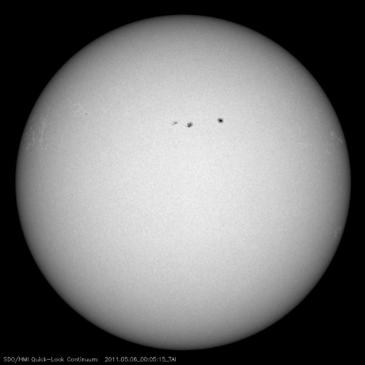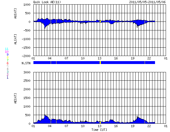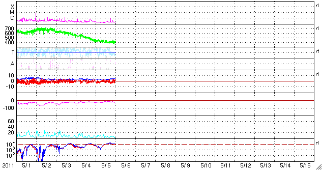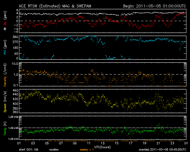 2011/ 5/ 6 09:46 更新 400km/秒付近の穏やかな太陽風が続いています。太陽も静穏です。 担当 篠原 太陽風の速度は、430km/秒から400km/秒へ緩やかに下がり、 磁場強度も4nTで安定しています。 太陽風は穏やかな状態を保っています。 このため、磁気圏も概ね静穏です。 太陽風磁場の南向きに対応して、 AE指数には小規模の変動が2回ほど観測されています。 太陽の南半球側にあるコロナホールは、太陽の中心線に達しています。 3日後の5月9日を目安として、高速太陽風がやって来る可能性があります。 前周期は、500〜600km/秒の状態が2日間ほど続きました。 今回高速風がやって来た場合も、同じくらいの規模でしょう。 放射線帯高エネルギー電子は、今日も10,000を超えています。 太陽風が穏やかなので、ゆっくりと減少するでしょう。 太陽の活動も穏やかです。 GOES衛星のX線グラフは、Bクラスの小さな変化が2回発生した程度です。 STEREO Behindを見ても、太陽の東側に特に活発な領域はなく、 静かな状態はしばらく続きそうです。 SDO衛星のAIA193カメラによる太陽コロナの様子 (c) SDO (NASA) ![]() SDO衛星による太陽の可視光写真。マウスの矢印を写真に重ねると、黒点番号付きの写真に切り替わります。 (c) SDO (NASA) ![]() ACEが観測した太陽風の磁場(1番上の枠、白線は全体の強度、赤線は南北成分) および、太陽風の密度(3番目の橙線)、速度(4番目の黄線) (c) NOAA/SWPC ![]() リアルタイムAE指数 下段のAEグラフの値が高くなると、オーロラ活動が活発化しています。 (c) 京都大学, NICT ![]() 27日の太陽周期に合わせたデータプロット 太陽が同じ面を地球に向けていた27日前の変化から、今後を予想することができます。 (c) 作図:宇宙天気ニュース