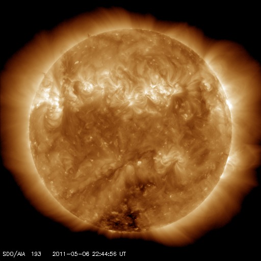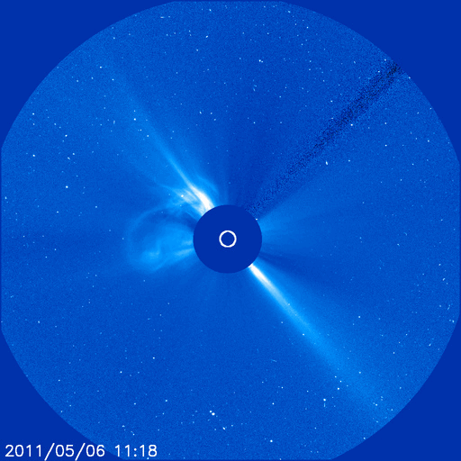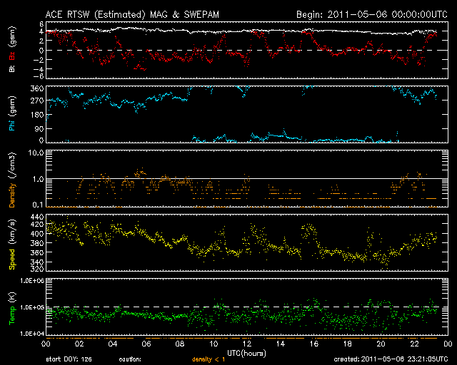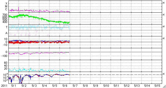 2011/ 5/ 7 08:21 更新 太陽の裏側でCMEが発生しています。太陽風は低速で、磁気圏も穏やかです。 担当 篠原 SOHO衛星LASCO C3カメラによると、 太陽の東側からCME(太陽ガスの噴出現象)が噴き出しています。 STEREO衛星を調べると、地球とは反対側で発生したフレアに関係した現象です。 地球への影響はありません。 太陽は、Bクラスの現象ですらほとんど発生せず、とても穏やかです。 黒点群は、1203、1204、1205と3つ見えていますが、 目立った活動はしていません。 太陽は、このまま穏やかな状態が続きそうです。 太陽風は、400km/秒を割り、300km/秒台後半で推移しています。 磁場強度も4nTで安定し、穏やかな太陽風です。 磁気圏も静穏で、AE指数はほとんど変化していません。 このまま明日くらいまで、速度の低い太陽風が続くでしょう。 そして、明後日、9日くらいから、コロナホールによる高速の太陽風が始まる可能性があります。 SDO衛星AIA193の南半球に見えているコロナホールです。 ただし、コロナホールは、中緯度から極にかけて高めの緯度に広がっています。 このため、地球へどの程度の影響がやって来るのか、 来てみないと分からないところもあります。 前周期は、3日程度の高速風がやって来ました。 今回も同程度の高速風が来るのかもしれません。 放射線帯の高エネルギー電子は、10,000のレベルを保っています。 引き続き、衛星の運用などでは注意が必要でしょう。 太陽の東半球の裏側で発生したCME。 (c) SOHO (ESA & NASA) ![]() SDO衛星のAIA193カメラによる太陽コロナの様子 (c) SDO (NASA) ![]() SDO衛星による太陽の可視光写真。マウスの矢印を写真に重ねると、黒点番号付きの写真に切り替わります。 (c) SDO (NASA) ![]() GOES衛星の太陽X線データ (c) NOAA/SWPC ![]() ACEが観測した太陽風の磁場(1番上の枠、白線は全体の強度、赤線は南北成分) および、太陽風の密度(3番目の橙線)、速度(4番目の黄線) (c) NOAA/SWPC ![]() リアルタイムAE指数 下段のAEグラフの値が高くなると、オーロラ活動が活発化しています。 (c) 京都大学, NICT ![]() 27日の太陽周期に合わせたデータプロット 太陽が同じ面を地球に向けていた27日前の変化から、今後を予想することができます。 (c) 作図:宇宙天気ニュース
