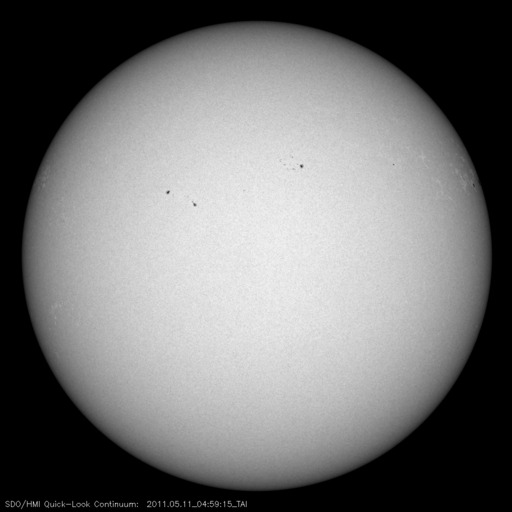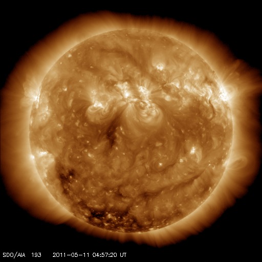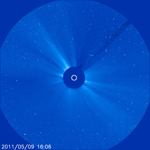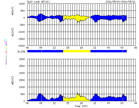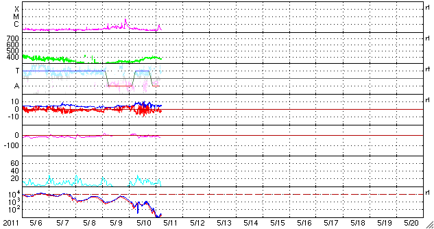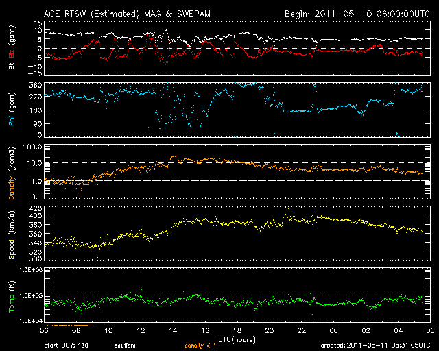 2011/ 5/11 14:28 更新 太陽風の速度は400km/秒に上がった程度で、高速風は来ませんでした。 担当 篠原 太陽風の高速風領域は、消えてしまったようです。 太陽風の速度は、昨夜から400km/秒近くまで上がりましたが、 変化はそこまでで、現在は360km/秒ほどに下がっています。 それでも、磁場強度は5〜10nT程度、プラズマ密度も10個/cm^3程度に、 それぞれ小幅ですが増加していて、高速風領域の痕跡は残っています。 ACEの24時間データでは変化が分かりにくいので、 27日周期の図の速度とIMFのグラフも見て下さい。 5月10日の小さな変化です。 磁気圏のオーロラ活動は、小規模ですが、 AE指数で500nT程度の変動が発生しています。 高速風にはなりませんでしたが、磁場強度がやや上がって、 南北成分が南寄りになっていた影響でしょう。 この後、太陽風の速度は再び下がって、低速風に戻ると思われます。 しばらく静かな風が続くでしょう。 放射線帯の高エネルギー電子は、小規模ですが磁気圏活動の影響を受けて、 大きく数を減らしています。 太陽では、お昼にB8の小さなフレアが発生しただけで、 活動は穏やかです。 黒点も、ずいぶん細ったものが見えるだけです。 SOHO衛星のLASCOカメラで、小さな彗星が太陽に突入する様子が撮影されています。 昨日のCMEの頃から見え始めて、今朝、太陽に消えて行った様です。 CMEと小さな彗星の競演。SOHO衛星 LASCO C2、C3カメラ (c) SOHO (ESA & NASA)、動画加工 : 宇宙天気ニュース ![]() SDO衛星のAIA193カメラによる太陽コロナの様子 (c) SDO (NASA) ![]() SDO衛星による太陽の可視光写真。マウスの矢印を写真に重ねると、黒点番号付きの写真に切り替わります。 (c) SDO (NASA) ![]() ACEが観測した太陽風の磁場(1番上の枠、白線は全体の強度、赤線は南北成分) および、太陽風の密度(3番目の橙線)、速度(4番目の黄線) (c) NOAA/SWPC ![]() リアルタイムAE指数 下段のAEグラフの値が高くなると、オーロラ活動が活発化しています。 (c) 京都大学, NICT ![]() 27日の太陽周期に合わせたデータプロット 太陽が同じ面を地球に向けていた27日前の変化から、今後を予想することができます。 (c) 作図:宇宙天気ニュース