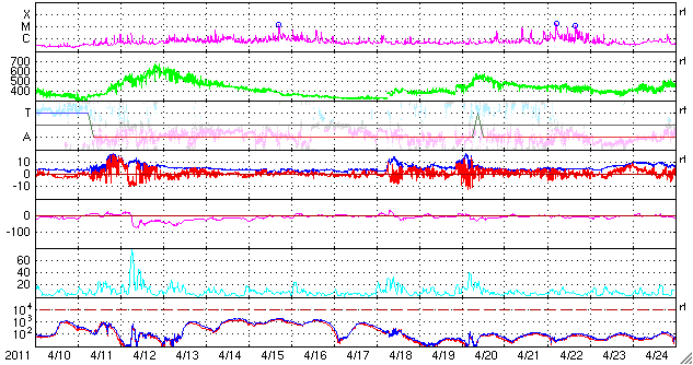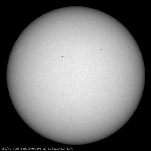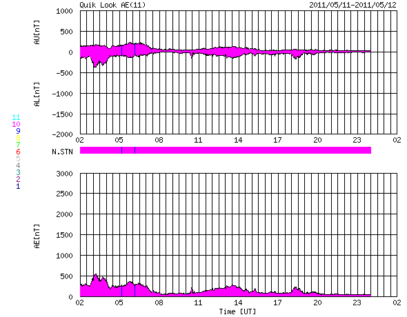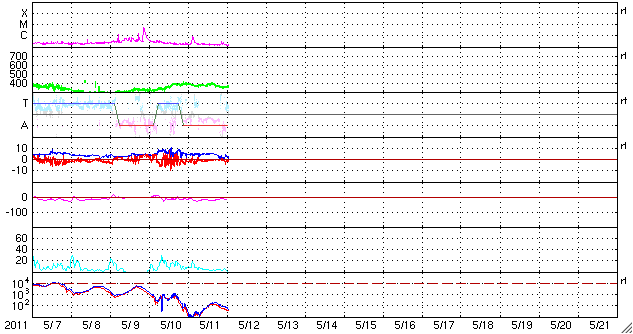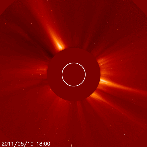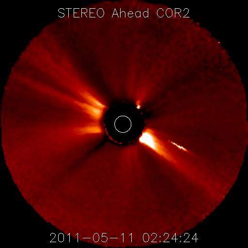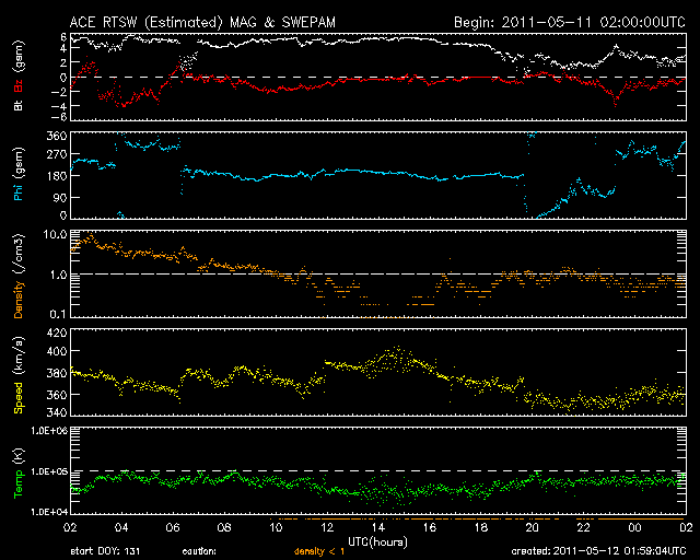 2011/ 5/12 10:59 更新 穏やかな太陽風が続いています。小さな彗星とCMEのきれいな写真が撮れています。 担当 篠原 昨日報告したB8のフレア(11日11時半、世界時11日2時半)に伴って、 CME(太陽ガスの放出現象)が発生しています。 SOHO衛星LASCO C2と、STEREO Ahead衛星COR2の動画を掲載します。 STEREO Aheadでは、地球は左側にあり、 CMEは地球の方向に向かって飛び出していることが分かります。 15日頃の太陽風に影響が見られるかもしれません。 速度の変動は小さそうですが、磁場のかたまりが流れてきて、 磁場が強い南向きになると、活発な磁気圏活動が発生する可能性があります。 たまたま、彗星が太陽に飛び込む直前に発生した現象で、 それぞれの動画で長く尾を引いた彗星とCMEが同時に見えています。 昨日のSOHOの画像では気付かなかったのですが、 STEREO Aheadを見ると、彗星は地球と反対側(右側)から太陽に突入しています。 太陽のフレア活動は、その後も穏やかに推移しています。 黒点も小さくなってしまって、元気がありません。 太陽風は、380〜360km/秒と低速の状態で安定しています。 磁場強度も5nTから2nTに下がり、弱くなっています。 磁気圏も静穏で、AE指数のグラフは目立った変化はありません。 これから2〜3日程度は低速の穏やかな太陽風が続きそうです。 今日のSDO AIA193には、太陽の中心に小さなコロナホールが見えています。 この影響が3〜4日後くらいにやって来るかもしれません。 コロナホールの規模から考えると、影響は小規模ではないかと思います。 これに、初めに書いたCMEの変動が重なってやって来るかもしれません。 太陽の西側でCMEが発生しました。ほぼ同時に小さな彗星が太陽に接近しています。 (c) SOHO (ESA & NASA) ![]() 同じCMEをSTEREO Aheadから撮影。地球は左側にあります。また、彗星は反対側から接近しています。 (c) STEREO (NASA) ![]() SDO衛星のAIA193カメラによる太陽コロナの様子 (c) SDO (NASA) ![]() SDO衛星による太陽の可視光写真。マウスの矢印を写真に重ねると、黒点番号付きの写真に切り替わります。 (c) SDO (NASA) ![]() GOES衛星の太陽X線データ (c) NOAA/SWPC ![]() ACEが観測した太陽風の磁場(1番上の枠、白線は全体の強度、赤線は南北成分) および、太陽風の密度(3番目の橙線)、速度(4番目の黄線) (c) NOAA/SWPC ![]() リアルタイムAE指数 下段のAEグラフの値が高くなると、オーロラ活動が活発化しています。 (c) 京都大学, NICT ![]() 27日の太陽周期に合わせたデータプロット 太陽が同じ面を地球に向けていた27日前の変化から、今後を予想することができます。 (c) 作図:宇宙天気ニュース