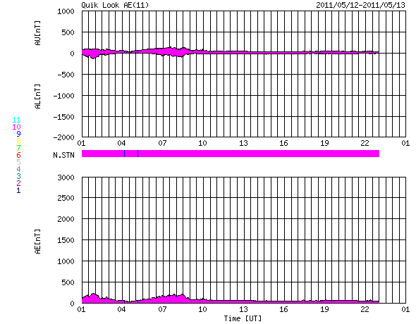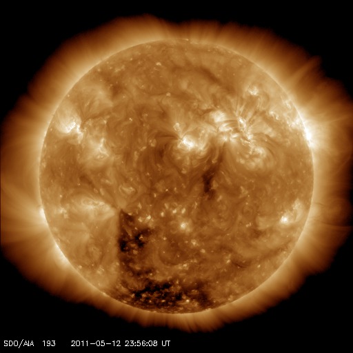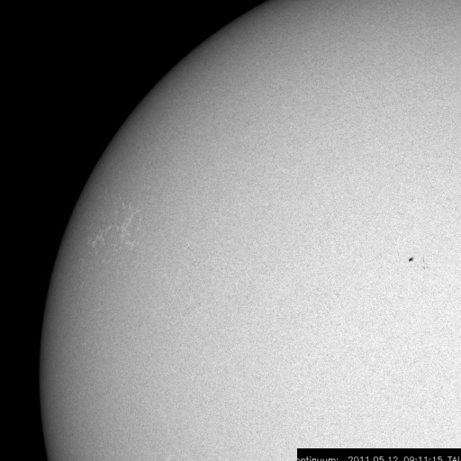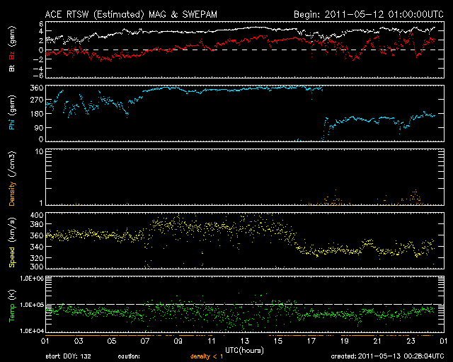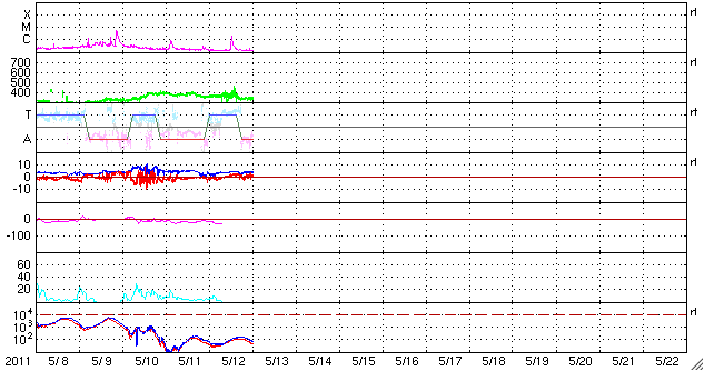 2011/ 5/13 09:28 更新 太陽風は330km/秒と遅くなり、磁気圏も穏やかです。 担当 篠原 昨夜、12日21時(世界時12日12時)に、 C2.0の小規模フレアが太陽の東端付近で発生しました。 可視光の写真には白斑しか見られず、黒点はできていない場所の様です。 規模は小さな現象ですが、 SDO衛星の画像では、見事な爆発の様子を見ることができます。 白斑しか見えない可視光の写真(元の写真の関係で、太陽の位置はずれています)とともに、 AIA193(茶色)、AIA304(赤色)の様子をご覧ください。 NOAA/SWPCの報告によると、フィラメントの消失と一緒に起きたそうで、 AIA304が迫力のある写真になっているのは、そのためでしょう。 太陽の活動としては、この現象くらいしかなく、 全体としては穏やかです。 黒点も小さなものしかありません。 太陽風は、速度が360km/秒から330km/秒へと更に低下し、 だいぶ遅い風になっています。 磁場強度は4nTくらいに戻ってきましたが、こちらも穏やかです。 磁気圏も静穏で、AE指数はほとんど変化していません。 今日、明日と静かに経過して、明後日かその翌日あたりから、 コロナホールの影響で太陽風に変化が見られるかもしれません。 ただし、コロナホールの規模は小さいので、影響は限定的でしょう。 SDO衛星AIA193の太陽コロナ写真では、南半球の中緯度付近に、 次のコロナホールも見えています。 太陽の北東で発生したC2.0の小規模フレア。ADO衛星の可視光(白黒)、AIA193(茶色)、AIA304(赤色)の動画。 (c) SDO (NASA)、動画加工 : 宇宙天気ニュース ![]() SDO衛星のAIA193カメラによる太陽コロナの様子 (c) SDO (NASA) ![]() SDO衛星による太陽の可視光写真。マウスの矢印を写真に重ねると、黒点番号付きの写真に切り替わります。 (c) SDO (NASA) ![]() GOES衛星の太陽X線データ (c) NOAA/SWPC ![]() ACEが観測した太陽風の磁場(1番上の枠、白線は全体の強度、赤線は南北成分) および、太陽風の密度(3番目の橙線)、速度(4番目の黄線) (c) NOAA/SWPC ![]() リアルタイムAE指数 下段のAEグラフの値が高くなると、オーロラ活動が活発化しています。 (c) 京都大学, NICT ![]() 27日の太陽周期に合わせたデータプロット 太陽が同じ面を地球に向けていた27日前の変化から、今後を予想することができます。 (c) 作図:宇宙天気ニュース