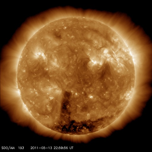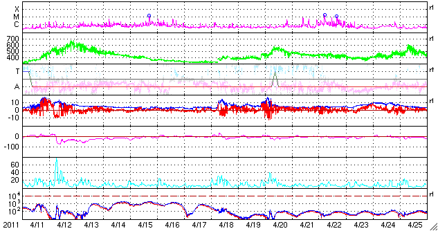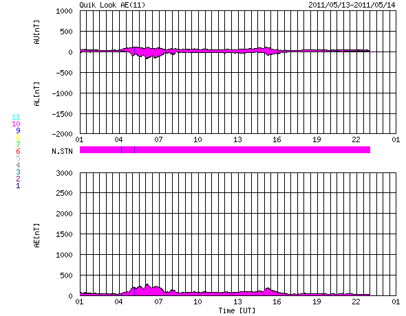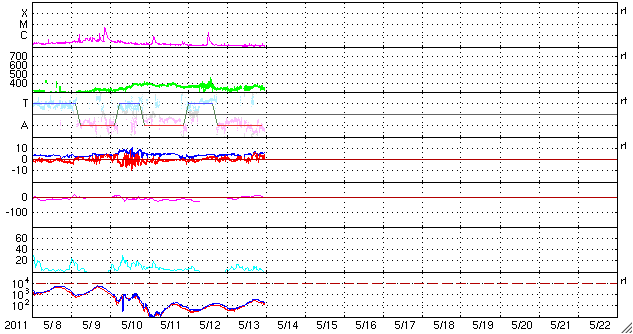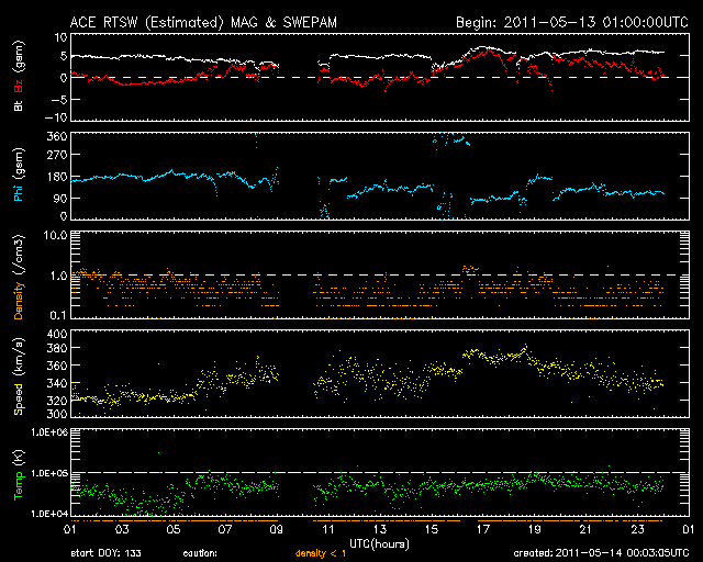 2011/ 5/14 09:03 更新 低速の穏やかな太陽風が続いています。明日くらいから高速風がやって来るかもしれません。 担当 篠原 太陽風の速度は、320〜360km/秒と低速で安定しています。 磁場強度も、5nTと平均的な強さで落ち着いています。 磁気圏も穏やかで、 オーロラの活動度を示すAE指数のグラフは、ほとんど変化していません。 今日もこのまま穏やかな状態が続きそうです。 SDO AIA193では、太陽の中央部に見えていたコロナホールが、 だいぶ西側(右側)に移動しています。 明日か明後日くらいに、太陽風に変化をもたらすかもしれません。 これに、11日に発生したCMEの影響も重なってやってくる可能性があります。 どちらも変化としては小規模に留まるでしょう。 そして、SDO AIA193を見ると、 南極から低緯度側に細長く伸びるコロナホールが見えています。 明日は太陽の中心線に達しているでしょう。 太陽は、目立ったフレア活動もなく穏やかです。 南半球の東側(左側)に新しい黒点が出現しています。 SDO衛星のAIA193カメラによる太陽コロナの様子 (c) SDO (NASA) ![]() SDO衛星による太陽の可視光写真。マウスの矢印を写真に重ねると、黒点番号付きの写真に切り替わります。 (c) SDO (NASA) ![]() ACEが観測した太陽風の磁場(1番上の枠、白線は全体の強度、赤線は南北成分) および、太陽風の密度(3番目の橙線)、速度(4番目の黄線) (c) NOAA/SWPC ![]() リアルタイムAE指数 下段のAEグラフの値が高くなると、オーロラ活動が活発化しています。 (c) 京都大学, NICT ![]() 27日の太陽周期に合わせたデータプロット 太陽が同じ面を地球に向けていた27日前の変化から、今後を予想することができます。 (c) 作図:宇宙天気ニュース
