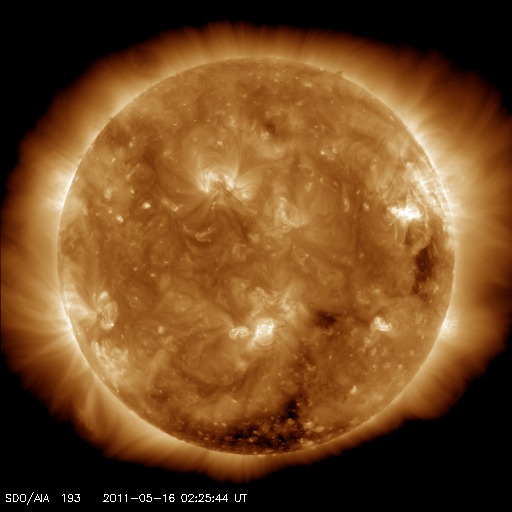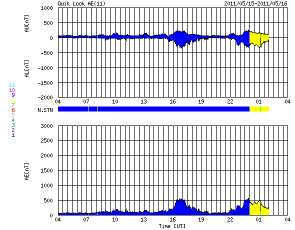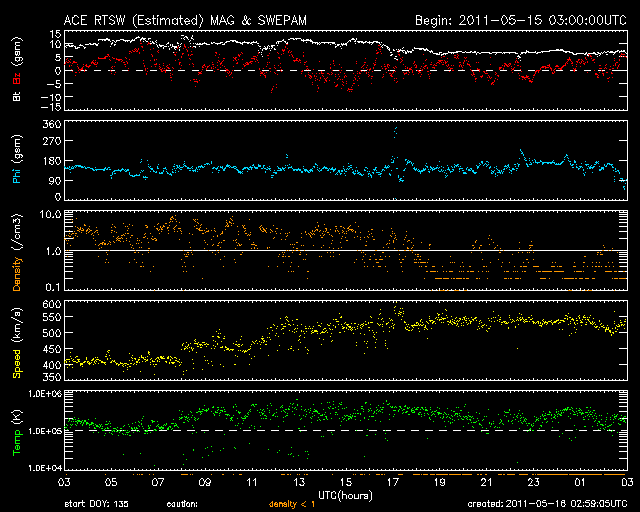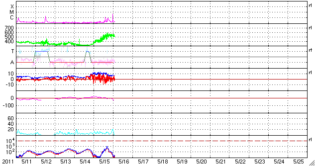 2011/ 5/16 12:00 更新 540km/秒の高速太陽風がやって来ました。C5の小規模フレアも発生しています。 担当 篠原 昨日の夕方から、太陽風は速度が500km/秒を越えて高速風になっています。 そのまま540km/秒で半日ほど安定して、 先ほどから500km/秒近くに下がりそうな気配を見せています。 10nTに強まっていた磁場強度も、速度が高まるとともに低下を始め、 現在は6nTと平均的なレベルです。 ただし、弱まるまでは下がっていないので、このまま速度が下がって行くのか、 まだしばらく高い速度を保つのか、予想しにくいところです。 磁気圏のオーロラ活動は、 AE指数で500nTほどの比較的小さな活動で留まっています。 速度があまり上がらなかったことと、磁場が南向きにそれほど強まらなかったためです。 今回の高速風は、あまり長く続かないと思いますが、 次のコロナホールの影響も近づいていて(昨日の記事の様に、18日頃からか?)、 しばらく太陽風の変化が続きそうです。 太陽では、16日8時半(世界時15日23時半)に、 C4.8の小規模フレアが発生しました。 NOAAの報告では西の端近くの1210黒点群の発生とありますが、 SDOやGOESの画像によると、その左隣の1208黒点群の様にも見えます。 まだ発生直後なので、CMEの様子などは分かりませんが、 端で発生しているので、地球への影響はないでしょう。 この他は、南半球の中心付近にある1214黒点群が 小さいですが活動的な様子を見せています。 黒点も増えていて、更に発達するかもしれません。 SDO衛星のAIA193カメラによる太陽コロナの様子 (c) SDO (NASA) ![]() SDO衛星による太陽の可視光写真。マウスの矢印を写真に重ねると、黒点番号付きの写真に切り替わります。 (c) SDO (NASA) ![]() ACEが観測した太陽風の磁場(1番上の枠、白線は全体の強度、赤線は南北成分) および、太陽風の密度(3番目の橙線)、速度(4番目の黄線) (c) NOAA/SWPC ![]() リアルタイムAE指数 下段のAEグラフの値が高くなると、オーロラ活動が活発化しています。 (c) 京都大学, NICT ![]() 27日の太陽周期に合わせたデータプロット 太陽が同じ面を地球に向けていた27日前の変化から、今後を予想することができます。 (c) 作図:宇宙天気ニュース