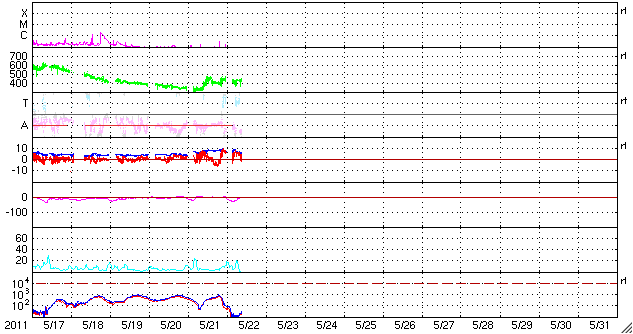 - 2011/ 5/21 11:58 太陽風は低速で、磁気圏は静穏。太陽も穏やかです。