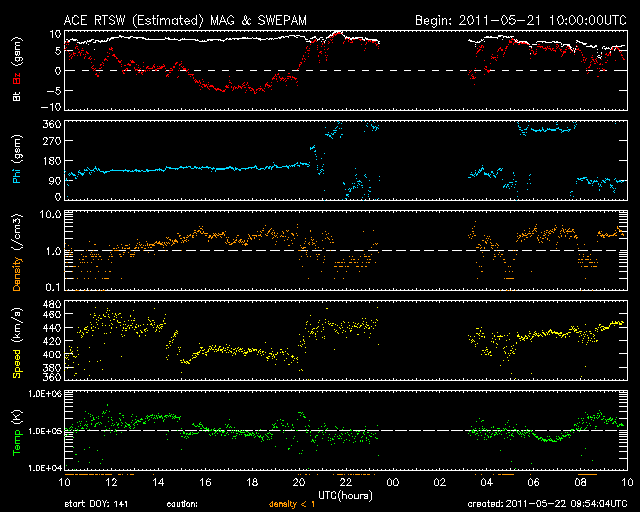 - 2011/ 5/19 10:51 太陽風の速度は下がりました。コロナホールの影響は終わったようです。