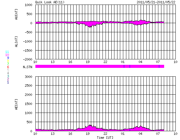 下段のAEグラフの値が高くなると、オーロラ活動が活発化しています。
