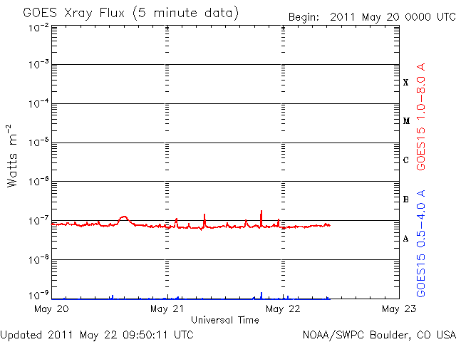 - 2011/ 5/20 09:23 太陽の活動は静穏です。太陽風も穏やかで、磁気圏も静かな状態です。