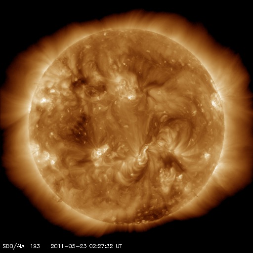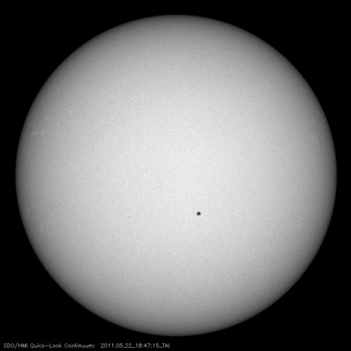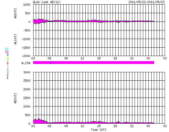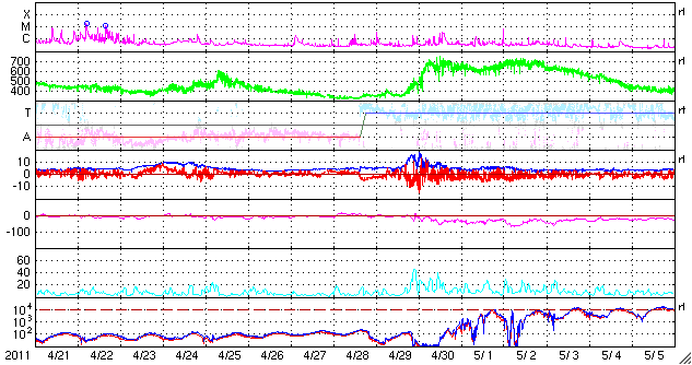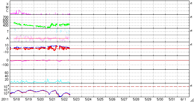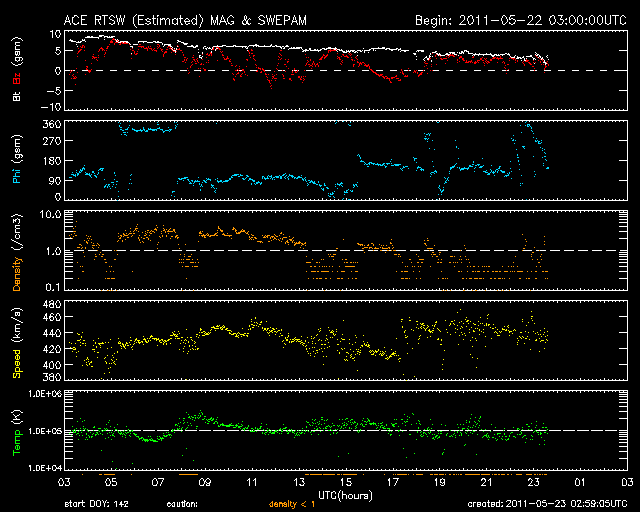 2011/ 5/23 11:59 更新 400km/秒台前半の太陽風が続いています。コロナホールの影響は見られるでしょうか。 担当 篠原 太陽風は、440km/秒前後の速度で安定しています。 27日周期の図を見ると、 前周期の4月25日前後に見られた速度の小さな高まりの回帰と言えるのかもしれません。 磁気圏は静穏で、AE指数はほとんど変化していません。 この後の太陽風は、淡く見えていたコロナホールの影響がやってくるのか、 このまま穏やかに過ぎて行くのかに注目しています。 また、27日周期の図では、前周期の4月30日に高速風が始まっています。 これは、今周期の5月27日に相当します。 SDO衛星AIA193の太陽の中央やや左側に見えるコロナホールの影響です。 コロナホールは少し小さくなっている様ですが、高速風はどうでしょうか。 太陽の活動も静かに推移しています。 X線のグラフはとても小さな変化しかなく、黒点も小さなものばかりです。 SDO衛星のAIA193カメラによる太陽コロナの様子 (c) SDO (NASA) ![]() SDO衛星による太陽の可視光写真。マウスの矢印を写真に重ねると、黒点番号付きの写真に切り替わります。 (c) SDO (NASA) ![]() ACEが観測した太陽風の磁場(1番上の枠、白線は全体の強度、赤線は南北成分) および、太陽風の密度(3番目の橙線)、速度(4番目の黄線) (c) NOAA/SWPC ![]() リアルタイムAE指数 下段のAEグラフの値が高くなると、オーロラ活動が活発化しています。 (c) 京都大学, NICT ![]() 27日の太陽周期に合わせたデータプロット 太陽が同じ面を地球に向けていた27日前の変化から、今後を予想することができます。 (c) 作図:宇宙天気ニュース