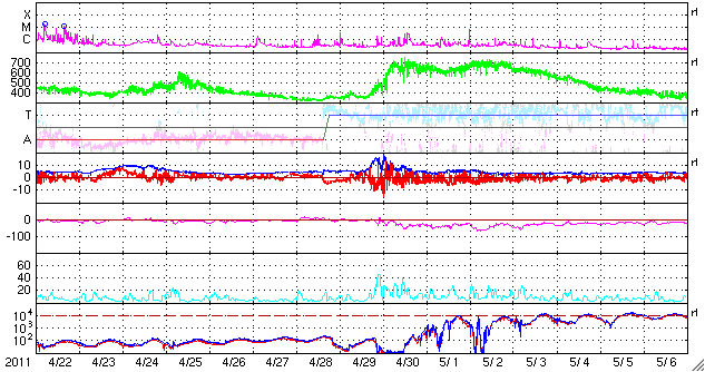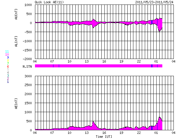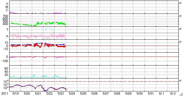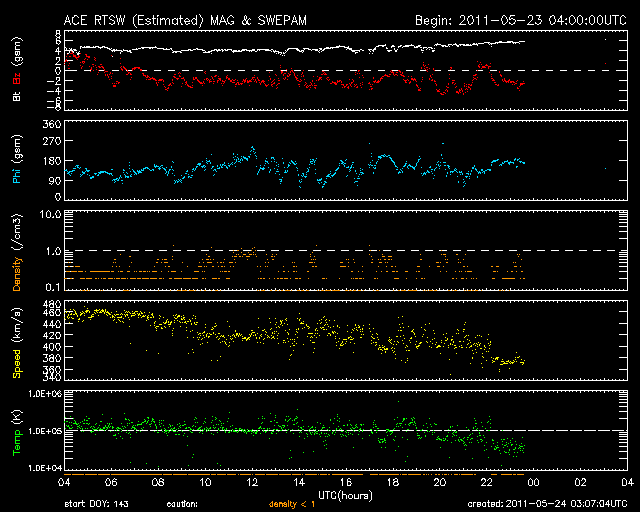 2011/ 5/24 12:08 更新 太陽風は低速風に変わりつつあります。太陽の中心にコロナホールが近づいています。 担当 篠原 21日に始まった太陽風速度の弱い高まり(27日周期の図を参照)は、 終わりつつある様です。 現在の太陽風は400km/秒台を割り、380km/秒に下がってきました。 磁気圏も概ね静穏ですが、AE指数の最後に中規模の変化が起きています。 これは、太陽風磁場の南向きが強まっているためではないでしょうか (ACEの最新データが欠けています)。 磁場強度もやや強まっているようですが、これが続くようだと、 磁気圏の活動もやや活発になるかもしれません。 太陽風は、しばらく低速の風が続き、 3〜4日ほど経つと、コロナホールの影響が及び始めそうです。 SDO衛星AIA193の太陽コロナ写真を見ると、 太陽の中心やや東(左)にコロナホールが見えています。 コロナホールの先頭(右端)が太陽の中心線に達するのは、もう少し後ですから、 高速風が始まるのは4日後くらいになるかもしれません。 27日周期の図によると、前周期は4月30日から高速風が始まっています。 最高速度は700km/秒にも達する強い風となりましたが、今回はどうなるでしょうか。 前周期の高速風では、オーロラの活動も活発になりました。 昭和基地のオーロラカメラの映像にも注目してください。 太陽は、黒点に変化はなく、穏やかな状態が続いています。 X線のグラフも静かなままです。 SDO衛星のAIA193カメラによる太陽コロナの様子 (c) SDO (NASA) ![]() SDO衛星による太陽の可視光写真。マウスの矢印を写真に重ねると、黒点番号付きの写真に切り替わります。 (c) SDO (NASA) ![]() ACEが観測した太陽風の磁場(1番上の枠、白線は全体の強度、赤線は南北成分) および、太陽風の密度(3番目の橙線)、速度(4番目の黄線) (c) NOAA/SWPC ![]() リアルタイムAE指数 下段のAEグラフの値が高くなると、オーロラ活動が活発化しています。 (c) 京都大学, NICT ![]() 27日の太陽周期に合わせたデータプロット 太陽が同じ面を地球に向けていた27日前の変化から、今後を予想することができます。 (c) 作図:宇宙天気ニュース