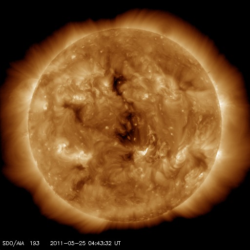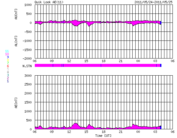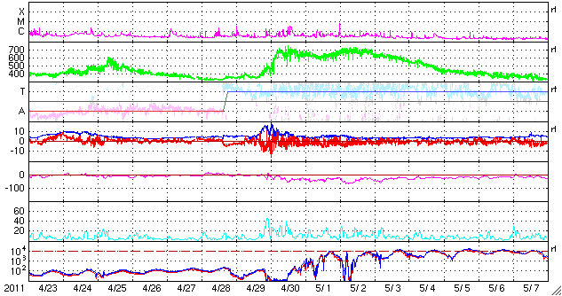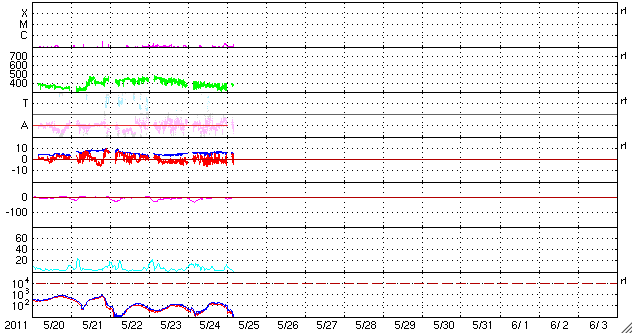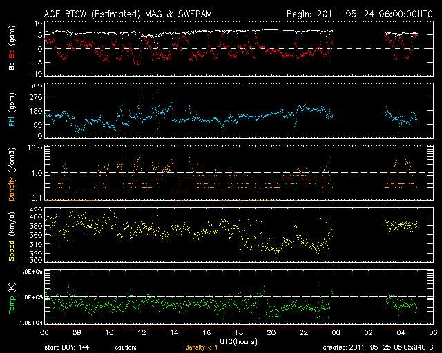 2011/ 5/25 14:05 更新 太陽風はやや低速で落ち着き、太陽の活動も静かです。 担当 篠原 太陽風の速度は、380km/秒とやや低速の状態で安定しています。 磁場強度も、6〜5nTで安定していて、強まるなどの変動はありませんでした。 磁気圏も穏やかで、AE指数は小さな変化が見られる程度です。 SDO衛星のAIA193では、コロナホールがちょうど太陽の中心に見えています。 3日後の27日には高速風が始まっている可能性が高いです。 コロナホールの大きさから考えると、それほど高い速度にはならないように思われますが、 前周期は最高700km/秒にまで達していて、今回どうなるか注目しています。 太陽の活動も穏やかです。 黒点は、1216群のひとつが見えているだけです。 SDO衛星のAIA193カメラによる太陽コロナの様子 (c) SDO (NASA) ![]() SDO衛星による太陽の可視光写真。マウスの矢印を写真に重ねると、黒点番号付きの写真に切り替わります。 (c) SDO (NASA) ![]() ACEが観測した太陽風の磁場(1番上の枠、白線は全体の強度、赤線は南北成分) および、太陽風の密度(3番目の橙線)、速度(4番目の黄線) (c) NOAA/SWPC ![]() リアルタイムAE指数 下段のAEグラフの値が高くなると、オーロラ活動が活発化しています。 (c) 京都大学, NICT ![]() 27日の太陽周期に合わせたデータプロット 太陽が同じ面を地球に向けていた27日前の変化から、今後を予想することができます。 (c) 作図:宇宙天気ニュース