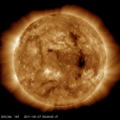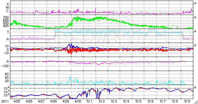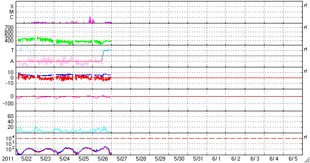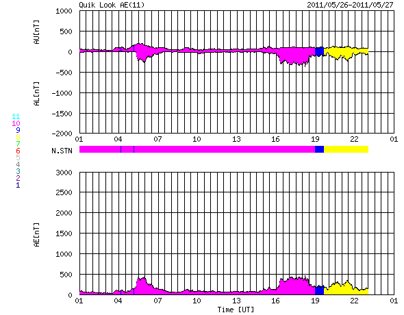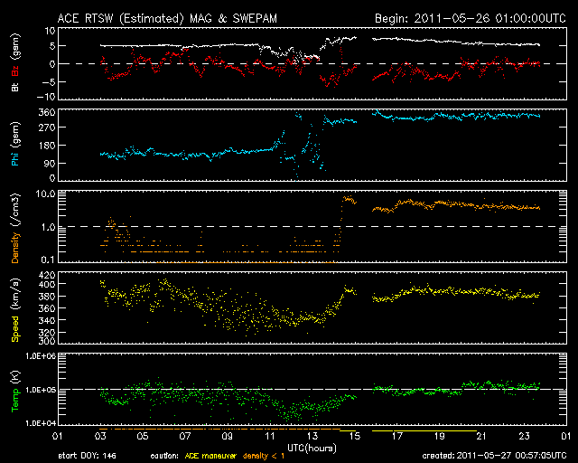 2011/ 5/27 09:58 更新 太陽風は平均的な速さになっています。今後、高速の太陽風が始まると思われます。 担当 篠原 太陽に新しい黒点が出現しています。 ひとつは、中心からやや南東(左下)の1223黒点群です。 この黒点群は、昨日のニュースで報告した2つのC1の小規模フレアを起こしています。 また、中央のやや北(上)と、北半球の東端にもそれぞれ黒点群が現れています。 黒点は増えましたが、X線のグラフはほとんど変化がなく、 太陽活動は穏やかです。 太陽風は、速度が380km/秒と平均的な速度付近に上がっています。 同時に、プラズマの密度が増え、磁場強度にも変化が発生していますが、 27日周期の図を見ると、太陽風磁場のセクターが「A」から「T」に切り替わっています。 これに関連した太陽風の変化だったようです。 前周期のグラフでも、4月28日にセクターの切り替わりが発生しています。 そして、1日半ほど遅れて高速の太陽風が始まりました。 今回も、これから明日にかけて高速風の到来が予想されます。 今後のACEのデータに注目してください。 SDO衛星のAIA193を見ると、コロナホールは太陽の西側に進み、 地球へ高速風が到達する目安の位置に近づいています。 現在の磁気圏は概ね静穏です。 太陽風磁場が南寄りになったため、300〜400nTほどの変化がAE指数に見られますが、 これは一旦落ち着くでしょう。 そして、今後高速風が始まると、オーロラの強まりも期待できます。 SDO衛星のAIA193カメラによる太陽コロナの様子 (c) SDO (NASA) ![]() SDO衛星による太陽の可視光写真。マウスの矢印を写真に重ねると、黒点番号付きの写真に切り替わります。 (c) SDO (NASA) ![]() GOES衛星の太陽X線データ (c) NOAA/SWPC ![]() ACEが観測した太陽風の磁場(1番上の枠、白線は全体の強度、赤線は南北成分) および、太陽風の密度(3番目の橙線)、速度(4番目の黄線) (c) NOAA/SWPC ![]() リアルタイムAE指数 下段のAEグラフの値が高くなると、オーロラ活動が活発化しています。 (c) 京都大学, NICT ![]() 27日の太陽周期に合わせたデータプロット 太陽が同じ面を地球に向けていた27日前の変化から、今後を予想することができます。 (c) 作図:宇宙天気ニュース