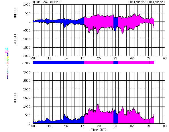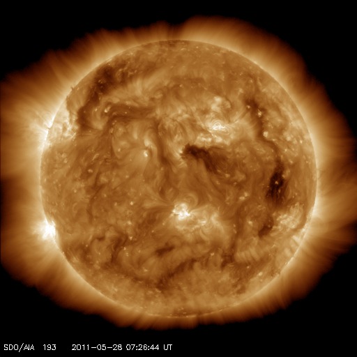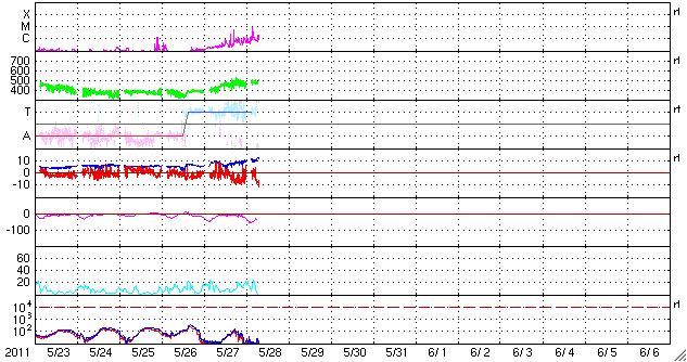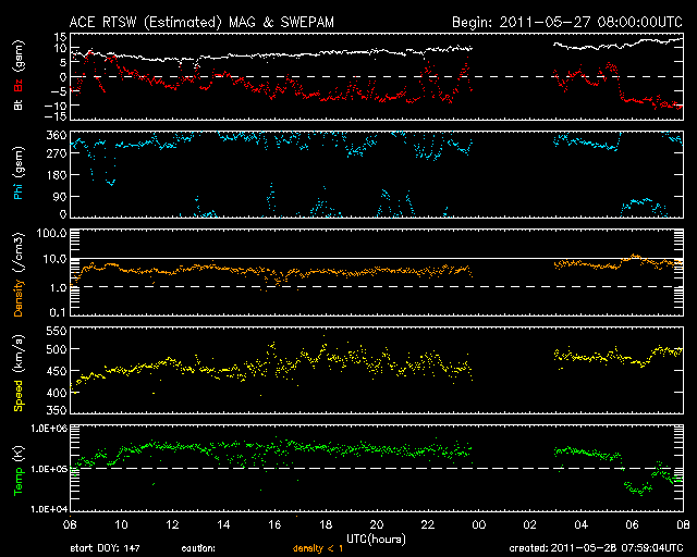 2011/ 5/28 16:59 更新 太陽風が500km/秒の高速風になりました。太陽でCクラスのフレアが頻発しています。 担当 篠原 高速の太陽風がやって来ました。 昨日のニュースの後から、太陽風の速度と磁場強度が共にゆっくりと上昇し、 半日ほどかけて、速度は470km/秒、磁場強度は10nT近くまで高まりました。 高速風は、更に強まる気配を見せていて、 28日16時(世界時28日7時)には、 磁場強度は12nT、速度は500km/秒へと上がっています。 磁場強度が強まり、プラズマ密度も高まっていることから、 この後に、更に速度の上昇が続く可能性があります。 前周期並みに、700km/秒規模にまで達するのでしょうか 今後のACEのデータに注目してください。 太陽風の強まりとともに、磁場の南北成分は南を向くようになりました。 -5nTから、現在は-10nTに達する強い南向きとなっています。 この影響で、磁気圏の活動は活発になっています。 AE指数は、800nTから、最大1100nTに及ぶ中規模の変動を示しています。 現在、南向き磁場が更に強まっていることから、 一層激しい擾乱が起きる可能性もあります。 また、Dst指数も、最大で-40nTの変化を記録していて、 弱い磁気嵐になっています。 -10nTの強い南向きの影響が現れるのはこれからで、 より規模の大きな磁気嵐になりそうです。 SDO衛星のAIA193では、コロナホールは太陽の西側に移動し、 地球へ強い影響が及んでいます。 コロナホールの規模を考えると、高速の太陽風はあまり長い時間続かないと思われますが、 今後どうなるでしょうか。 ここしばらくおとなしかった太陽のX線グラフは、 急に活発になっています。 昨夜から現在にかけて、 C2.1、C5.6、C1.1、C1.4、C1.2、C1.4、C1.6、C8.3と、 Cクラスの小規模フレアが次々と発生しています。 最大のものは、後一歩でMクラスでした。 これらは、太陽の南東(左下)から上がってきた、1226黒点群が起こしたものです。 可視光写真では、大きな黒点が顔を出しています。 今後の活動に注目してください。 今日は学校行事の関係で、更新が夕方になってしまいました。 SDO衛星のAIA193カメラによる太陽コロナの様子 (c) SDO (NASA) ![]() SDO衛星による太陽の可視光写真。マウスの矢印を写真に重ねると、黒点番号付きの写真に切り替わります。 (c) SDO (NASA) ![]() ACEが観測した太陽風の磁場(1番上の枠、白線は全体の強度、赤線は南北成分) および、太陽風の密度(3番目の橙線)、速度(4番目の黄線) (c) NOAA/SWPC ![]() リアルタイムAE指数 下段のAEグラフの値が高くなると、オーロラ活動が活発化しています。 (c) 京都大学, NICT ![]() 27日の太陽周期に合わせたデータプロット 太陽が同じ面を地球に向けていた27日前の変化から、今後を予想することができます。 (c) 作図:宇宙天気ニュース