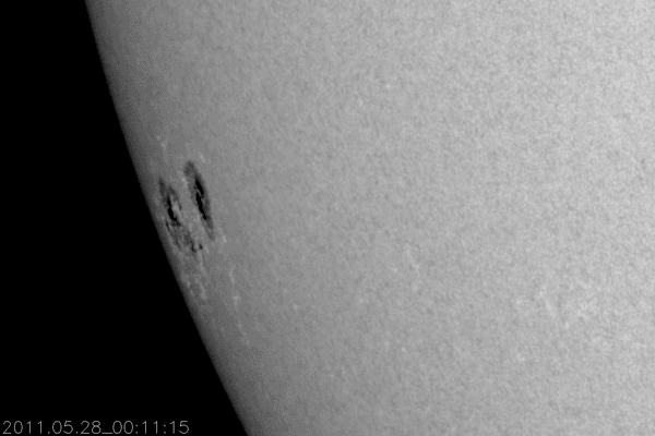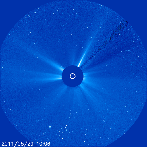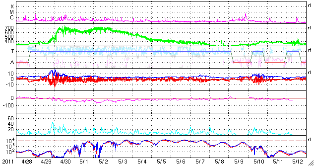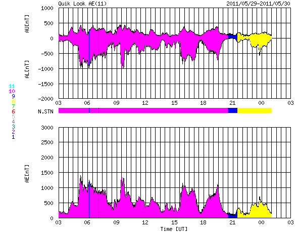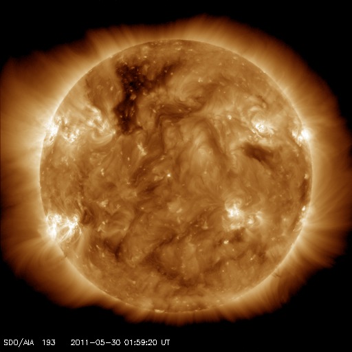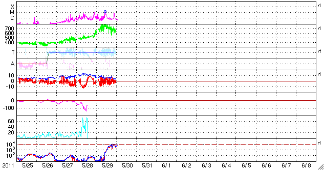 2011/ 5/30 11:32 更新 中小規模のフレアが続いています。高速風は750km/秒を超え、活発なオーロラ活動を起こしています。 担当 篠原 太陽の東端から、1226黒点群に続いて、1227黒点群が現れました。 その様子を、SDO衛星の可視光写真による動画で紹介します。 1226黒点群は複雑な形をしていて、大きなエネルギーを蓄えていると考えられます。 そして、昨日報告したM1.2に続いて、 29日19時(世界時29日10時)にもM1.4の中規模フレアを起こしています。 また、今朝、30日6時(世界時29日21時)にはC8.8の大きな小規模フレアが発生していますが、 ADO AIA193を見ると、隣の1227黒点群で発生している様です。 この2つの黒点群の活動には今後も注目です。 上記の2つのフレアでは、CME(太陽ガスの放出現象)も発生しています。 SOHO衛星LASCO C3の動画をご覧ください。 地球からは横方向への噴出ですので、影響はありません。 太陽面には次々と黒点が現われています 北半球には、西(右)から、1222、1224、1225、番号無し、1228と、 掲載の可視光写真でも5つの黒点群が確認できます。 しばらく静かだった太陽ですが、再び活発になってきました。 太陽風も擾乱が続いています。 昨日のニュースの後、太陽風の速度は大きく上昇し、 750km/秒を超えるほどになりました。 半日ほど続いた後、ゆっくりと下がり始めましたが、 現在も670km/秒とかなり高い速度を保っています。 27日周期の図によると、前周期の高速風と同じような規模の高速風となりました。 一方、SDO衛星AIA193で見えていたコロナホールは、それほどの大きさでもなく、 発生源の様子からは予想しずらい規模の強い高速風となっています。 磁気圏のオーロラ活動も活発に続いていて、 AE指数では、1000〜1300nTの激しい変動が頻繁に発生しています。 太陽風の速度がかなり高くなったことと、 磁場の南北成分が、5nTを超えるくらいの大きめの振幅で、 南北に振れ続けていることが影響しているのでしょう。 現在の太陽風は、磁場強度が5nTに下がっています。 たいへん高い速度の領域は終わりそうですが、磁場強度としてはまだ弱まっていないので、 高速状態は続きそうです。 27日周期の図の前周期を参考にすると、もう2〜3日程度続く可能性もあります。 今回の大きな擾乱の影響で、放射線帯の高エネルギー電子が大きく増加しています。 一気に、10,000の警戒ラインに達しました。 この後、更に増加する可能性もあり、 衛星の運用などでは注意が必要な状態になっています。 太陽の東端から上がってきた、1226黒点群(右)と1227黒点群(左)。SDO衛星可視光写真より。 (c) SDO (NASA)、動画加工 : 宇宙天気ニュース ![]() 中規模フレアなどにより、CME(太陽ガスの放出現象)が東の端で発生しています。 (c) SOHO (ESA & NASA) ![]() SDO衛星のAIA193カメラによる太陽コロナの様子 (c) SDO (NASA) ![]() SDO衛星による太陽の可視光写真。マウスの矢印を写真に重ねると、黒点番号付きの写真に切り替わります。 (c) SDO (NASA) ![]() GOES衛星の太陽X線データ (c) NOAA/SWPC ![]() ACEが観測した太陽風の磁場(1番上の枠、白線は全体の強度、赤線は南北成分) および、太陽風の密度(3番目の橙線)、速度(4番目の黄線) (c) NOAA/SWPC ![]() リアルタイムAE指数 下段のAEグラフの値が高くなると、オーロラ活動が活発化しています。 (c) 京都大学, NICT ![]() 27日の太陽周期に合わせたデータプロット 太陽が同じ面を地球に向けていた27日前の変化から、今後を予想することができます。 (c) 作図:宇宙天気ニュース