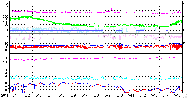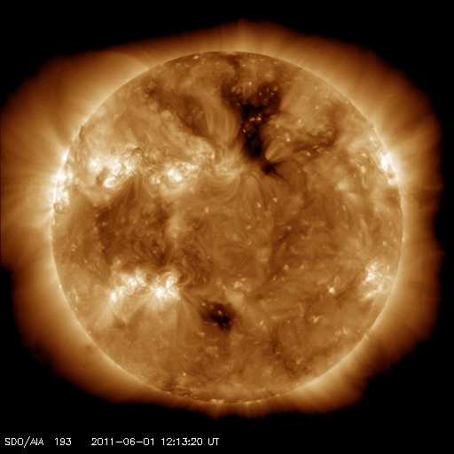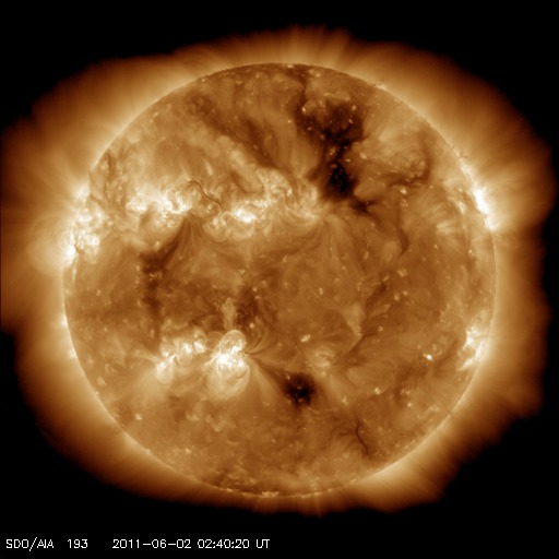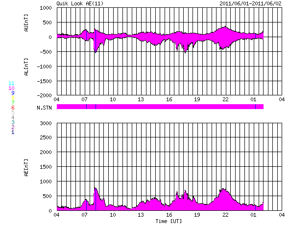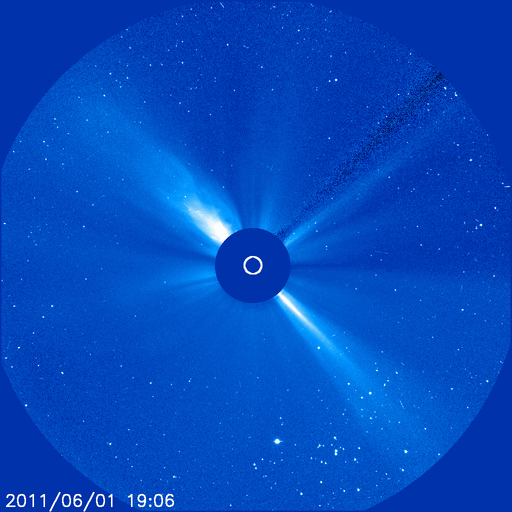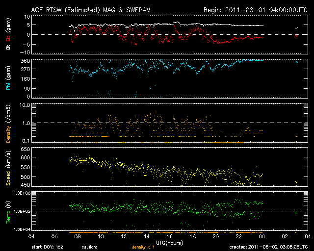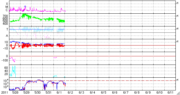 2011/ 6/ 2 12:08 更新 C4のフレアが発生し、CMEが地球方向に噴き出しています。高速太陽風は終わりつつあります。 担当 篠原 2日2時(世界時1日17時)に、太陽の南半球側の1226黒点群でC4.1の小規模フレアが発生し、 それに続いてCME(太陽ガスの放出現象)が発生しています。 それぞれの様子を動画で紹介します。 フレアは太陽の中心線付近で発生しているため、 CMEは地球へ向かって噴き出していることになります。 SOHO LASCO C3の写真(青)では、ガスがとても淡くて見にくいですが、 太陽の左側を包むように広がって行く様子が見えます。 また、STEREO Ahead COR2(赤)では、地球は写真の左側にあります。 そちらへ向かって、激しくCMEが噴出する様子が見えます。 フレアの規模が小さいことから、CMEの速度はあまり高くないでしょう。 3〜4日後の6月5〜6日頃に地球に到達するのではないかと思います。 太陽風の磁場強度が強まって、大きく南を向くなどすると、 強い磁気圏の擾乱が発生します。 その他は、目立ったフレア活動はありませんが、 北半球の東側に新しい黒点がいくつも現れています。 今後の発達に注意してください。 太陽風は、ゆっくりと速度が低下し、500km/秒を割りつつあるところです。 高速風は一旦終わりつつあります。 磁気圏のオーロラ活動は、500nT前後の中小規模の活動が続いています。 太陽風の速度が下がる傾向にあるので、 こちらの変動も次第に小さくなって行くでしょう。 太陽風の速度は、もうしばらく低下が続きそうですが、 明日になると次のコロナホール(SDO AIA193の右上のコロナホール) の影響が及び始めるかもしれません。 再び500km/秒に上がり、高速風になる可能性があります。 その後は、今日のCMEの影響も考慮する必要があるでしょう。 放射線帯の高エネルギー電子は、今日もぎりぎりで10,000に達しました。 太陽風が落ち着いてきたので、当面、減少はゆっくりになります。 SDO衛星のAIA193カメラによる、C4フレアの様子。 (c) SDO (NASA)、動画加工 : 宇宙天気ニュース ![]() C4フレアに続いて発生したCME。SOHO LASCO C3とSTEREO Ahead COR2による。 (c) SOHO (ESA & NASA)、STEREO (NASA)、動画加工 : 宇宙天気ニュース ![]() SDO衛星のAIA193カメラによる太陽コロナの様子 (c) SDO (NASA) ![]() SDO衛星による太陽の可視光写真。マウスの矢印を写真に重ねると、黒点番号付きの写真に切り替わります。 (c) SDO (NASA) ![]() GOES衛星の太陽X線データ (c) NOAA/SWPC ![]() ACEが観測した太陽風の磁場(1番上の枠、白線は全体の強度、赤線は南北成分) および、太陽風の密度(3番目の橙線)、速度(4番目の黄線) (c) NOAA/SWPC ![]() リアルタイムAE指数 下段のAEグラフの値が高くなると、オーロラ活動が活発化しています。 (c) 京都大学, NICT ![]() 27日の太陽周期に合わせたデータプロット 太陽が同じ面を地球に向けていた27日前の変化から、今後を予想することができます。 (c) 作図:宇宙天気ニュース