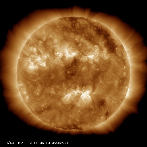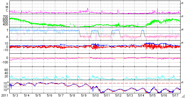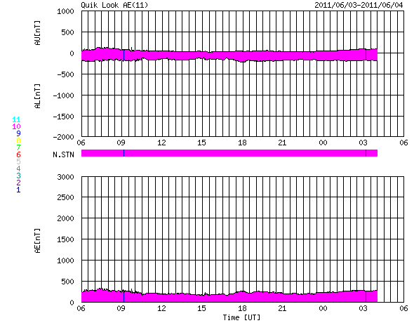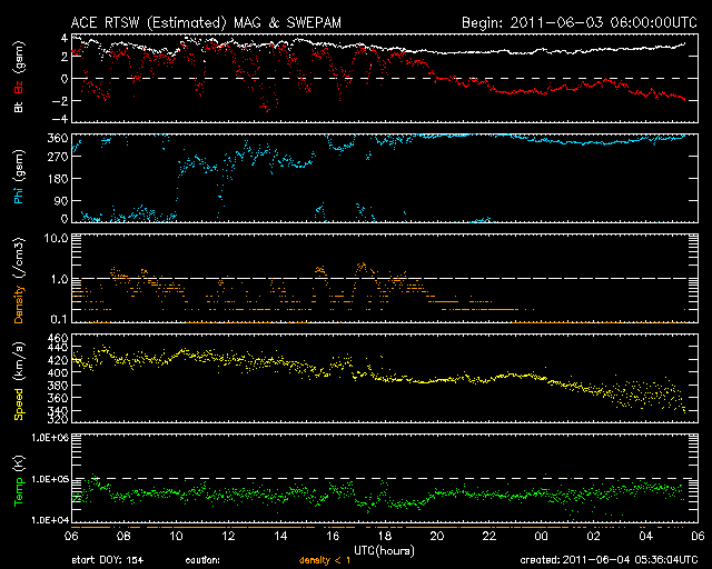 2011/ 6/ 4 14:36 更新 太陽風は低速になっています。明日以降、CMEによる太陽風の乱れが始まりそうです。 担当 篠原 太陽風の速度は、400km/秒を割り、 360km/秒と低速状態に入っています。 磁場強度も、3nTと弱くなっています。 コロナホールの影響は来なかったようです。 すると、次の注目は6月1日と2日に発生したCME(太陽ガスの放出現象)の到来です。 明日、明後日くらいに、地球に到達するのではないかと思います。 太陽風の速度はあまり高まらないだろうと思います。 それよりも、磁場強度の大きな強まりがやって来る可能性があります。 その時、磁場の南北成分が大きく南を向くと、 磁気圏にエネルギーが大きく流れ込み、活発なオーロラや磁気嵐を起こします。 ACEの図の白線(磁場強度)と赤線(磁場の南北成分)に注目してください。 現在の磁気圏は静穏です。 AE指数はずっと太いグラフが出ていますが、これはデータの問題でしょう。 放射線帯の高エネルギー電子は、10,000に達する高いレベルを保っています。 こちらは、磁気圏活動が静かになるとゆっくりとしか減少しません。 注意が必要な状態が続きます。 太陽では、C2.5、C1.6の小規模フレアを、 南半球の1226黒点群が起こしています。 目立った活動はこのくらいで、全体的には太陽は静かな印象です。 SDO衛星のAIA193カメラによる太陽コロナの様子 (c) SDO (NASA) ![]() SDO衛星による太陽の可視光写真。マウスの矢印を写真に重ねると、黒点番号付きの写真に切り替わります。 (c) SDO (NASA) ![]() ACEが観測した太陽風の磁場(1番上の枠、白線は全体の強度、赤線は南北成分) および、太陽風の密度(3番目の橙線)、速度(4番目の黄線) (c) NOAA/SWPC ![]() リアルタイムAE指数 下段のAEグラフの値が高くなると、オーロラ活動が活発化しています。 (c) 京都大学, NICT ![]() 27日の太陽周期に合わせたデータプロット 太陽が同じ面を地球に向けていた27日前の変化から、今後を予想することができます。 (c) 作図:宇宙天気ニュース