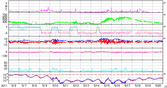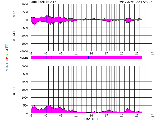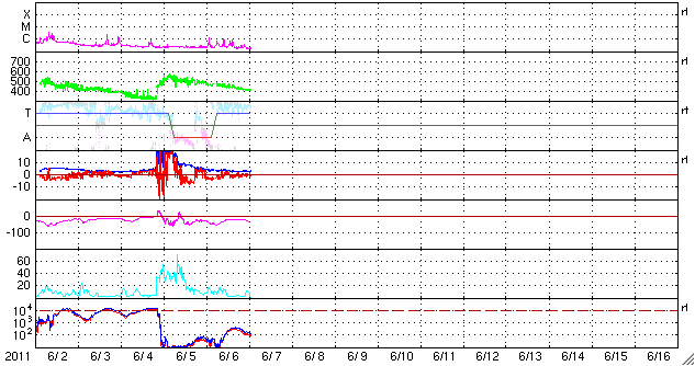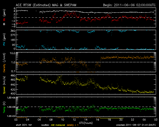 2011/ 6/ 7 10:42 更新 太陽風は平均的な速度になり、磁気圏活動も穏やかです。 担当 篠原 太陽風の速度はゆっくり下がって、400km/秒と平均的な値に落ち着いています。 ACEのグラフでは、上から下まで大きく下がったように見えますが、 数字としては、460km/秒から400km/秒に下がっただけの小幅の変化です。 27日周期の図の緑色のグラフを見ると、 ゆっくりとした変化だということが分かります。 磁場強度も、4nTから3nTと弱まっています。 太陽風は穏やかな風になっています。 磁気圏も概ね静穏で、AE指数は小規模の変化が時々発生している程度です。 太陽風は、基本的にはこのまま穏やかに推移するでしょう。 明日か明後日くらいに、昨日お知らせしたCMEの影響がやって来るかもしれません。 一時的な磁場強度の高まりと、それによる磁気圏活動の活発化が考えられます。 一方、現在の太陽には目立ったコロナホールは見られません(SDO衛星AIA193)。 前周期には中心付近に小さなコロナホールがあったのですが、現在ははっきりせず、 しばらく穏やかな太陽風が続きそうです。 太陽では、Bクラスの小さなフレアが頻発しています。 北西(右上)の1228黒点群が活動を強めているようです。 しかし、黒点の規模は小さく、 現状では特に大きな活動にはならないだろうと思います。 全体としては、5月の下旬から始まった太陽活動の高まりも一段落の印象です。 放射線帯の高エネルギー電子は、低いままで推移しています。 次の擾乱が来るまでは、この状態が続くでしょう。 SDO衛星のAIA193カメラによる太陽コロナの様子 (c) SDO (NASA) ![]() SDO衛星による太陽の可視光写真。マウスの矢印を写真に重ねると、黒点番号付きの写真に切り替わります。 (c) SDO (NASA) ![]() ACEが観測した太陽風の磁場(1番上の枠、白線は全体の強度、赤線は南北成分) および、太陽風の密度(3番目の橙線)、速度(4番目の黄線) (c) NOAA/SWPC ![]() リアルタイムAE指数 下段のAEグラフの値が高くなると、オーロラ活動が活発化しています。 (c) 京都大学, NICT ![]() 27日の太陽周期に合わせたデータプロット 太陽が同じ面を地球に向けていた27日前の変化から、今後を予想することができます。 (c) 作図:宇宙天気ニュース