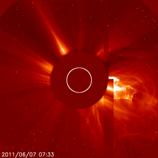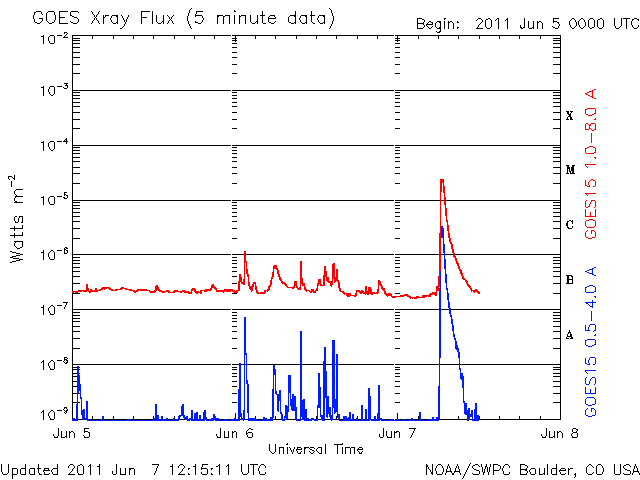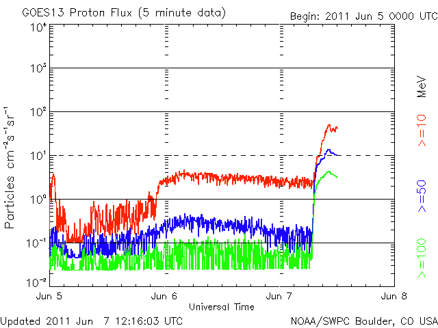 2011/ 6/ 7 21:17 更新 M2.5の中規模フレアが発生し、CMEが激しく噴出しています。 担当 篠原 7日15時(世界時7日6時)に、太陽の南西にある1226黒点群で、 M2.5の中規模フレアが発生しました。 フレアとしては、特に大きな現象ではないのですが、 たいへん華々しくCME(太陽ガスの放出現象)を起こしています。 その様子を速報として紹介します。 ガスが噴き上がる様子は、 SDO衛星のAIA193とAIA304の両方で良く写っています。 AIA193の拡大写真を見ると、 ダークフィラメントの様な暗いプラズマの橋が フレアが発生する明るい領域をまたいでいます。 ちょうどそこでフレアが発生したので、 この様な豪快なCMEになったのでしょうか。 (この文章は、私の個人的な感想です。 この現象の正確な分析は、太陽研究者の見解を参照してください) SDO衛星に続いて、SOHO衛星のLASCO C2、C3カメラでも、 激しいCMEの様子が撮影されています。 残念なことに、ちょうどデータが途切れていて、 太陽から噴きだした頃の写真はありませんでした。 太陽の可視光写真も見て下さい。 1226黒点群は、かすれて消えてしまいそうな姿でしかありません。 この現象に伴って、太陽放射線も増加しています。 既に10の線を超えていて、警戒レベルに達しています。 SDO衛星のAIA193カメラによる、M2.5のフレアの様子。フレアの後にコロナのガスが噴出する様子が見えている。 (c) SDO (NASA)、動画加工 : 宇宙天気ニュース ![]() SDO衛星のAIA304カメラによる、M2.5のフレアの様子。コロナのガスが激しく噴き上がっている。 (c) SDO (NASA)、動画加工 : 宇宙天気ニュース ![]() SOHO LASCO C2、C3カメラによる、CMEの様子。 (c) SOHO (ESA & NASA)、動画加工 : 宇宙天気ニュース ![]() SDO衛星による太陽の可視光写真。マウスの矢印を写真に重ねると、黒点番号付きの写真に切り替わります。 (c) SDO (NASA) ![]() GOES衛星の太陽X線データ (c) NOAA/SWPC ![]() GOES衛星の太陽放射線データ (c) NOAA/SWPC ![]() | ||||||||||||||||||||||||||||||||||||||||||||||||||||||||||||||||||||||||||||||||||||||||||||||||||||||||||||||||||||||||||||||||||||||||||||||||||||||||||||||||||||||||||||||||||||||||||||||||||||||||||||||