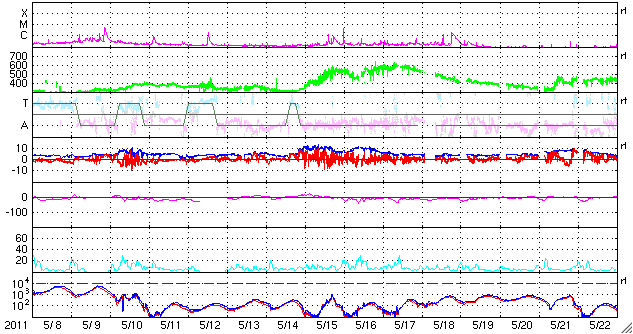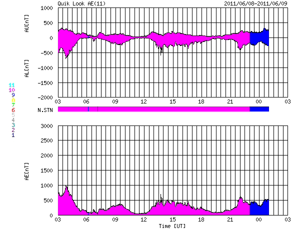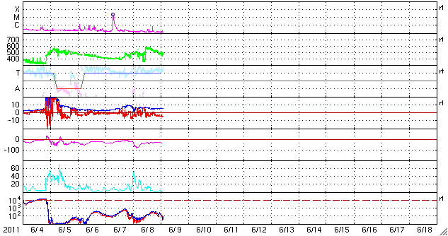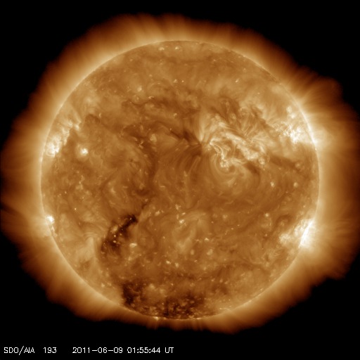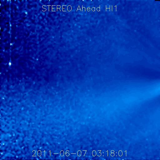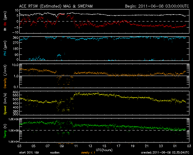 2011/ 6/ 9 11:32 更新 500km/秒前後の高速太陽風が続いています。明日くらいにCMEの影響が来るでしょう。 担当 篠原 気分的には、一昨日の激しいCME(太陽ガスの放出現象)の余韻がまだ残っています。 STEREO AheadのCOR2によるCMEの動画を昨日掲載しましたが、 その更に外側の様子を、同じSTEREO AheadのHi1カメラで紹介します。 今日の1枚目の青い動画です。 写真の右側に太陽があり、そこから飛びだしてきたガスが、 地球のある左方向に向かって流れています。 Hi1の写真の時間間隔は、ずいぶん開いているので、 いつものCOR2やLASCOと比べると、 動画で見えているガスの移動速度は、実際にはもっとゆっくりです。 ガスの最も濃い部分は、地球の方向からは外れています。 地球へは、CMEの周辺の薄い部分がやって来るでしょう。 どの程度の乱れがやって来るのか、明日、明後日の太陽風データに注目してください。 また、京都大学の柴田先生にお願いして、 今回のイベントについてコメントをいただきました。 昨日のニュースに掲載していますので、ぜひご覧ください。 昨日以降の太陽は、目立ったフレア活動もなく、とても静かです。 黒点は更に減って、 1232黒点群(中央やや右)と1227黒点群(右下端)が小さく見えているだけです。 太陽風は、昨夜に再び速度が上がって、550km/秒を超えるほどになりました。 現在は480km/秒くらいに下がっていますが、弱い高速風が続いています。 磁場強度は5nTと平均的な強さです。 オーロラ活動は、AE指数で500nT前後と、ある程度活発な状態が続いています。 太陽風の速度が高まっていることと共に、 磁場の南北成分が南寄りになっているためです。 今回の高速風がどこまで続くか、予想はなかなか難しいのですが、 一方、明日くらいにCMEの影響がやって来ると考えられます。 速度はそれほど高まらないと思いますが、 磁場強度が高まって、強い南向きになると、磁気嵐や活発なオーロラ活動が発生します。 ACEのデータの速度(黄色線)とともに、磁場の南北成分(赤線)に注目してください。 STEREO AheadのHi1による、地球方向へ広がって行くCMEのガス。 (c) STEREO (NASA)、 (動画加工 : 宇宙天気ニュース) ![]() STEREO AheadのCOR2によるCME。この動画の左側に前のHi1の動画が繋がります。 (c) STEREO (NASA)、 (動画加工 : 宇宙天気ニュース) ![]() SDO衛星のAIA193カメラによる太陽コロナの様子 (c) SDO (NASA) ![]() SDO衛星による太陽の可視光写真。マウスの矢印を写真に重ねると、黒点番号付きの写真に切り替わります。 (c) SDO (NASA) ![]() GOES衛星の太陽X線データ (c) NOAA/SWPC ![]() ACEが観測した太陽風の磁場(1番上の枠、白線は全体の強度、赤線は南北成分) および、太陽風の密度(3番目の橙線)、速度(4番目の黄線) (c) NOAA/SWPC ![]() リアルタイムAE指数 下段のAEグラフの値が高くなると、オーロラ活動が活発化しています。 (c) 京都大学, NICT ![]() 27日の太陽周期に合わせたデータプロット 太陽が同じ面を地球に向けていた27日前の変化から、今後を予想することができます。 (c) 作図:宇宙天気ニュース
