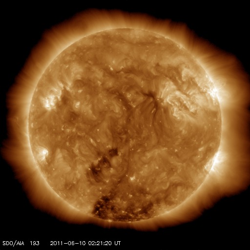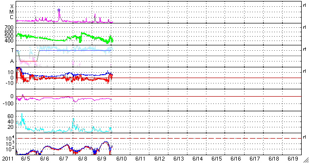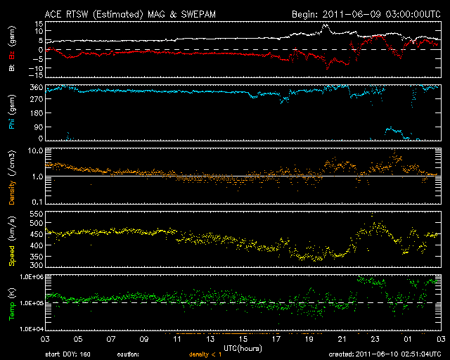 2011/ 6/10 11:52 更新 太陽風に小規模の乱れがやって来ました。7日のCMEの影響はこの後です。 担当 篠原 今日の早朝、太陽風に小規模の変化がやって来ました。 磁場強度が10nT(一時的に15nTまで)に強まり、 続いて、350km/秒に下がっていた速度が500km/秒近くに上がったのです。 変化は短時間で終わり、既に磁場強度は5nTに、 速度も450km/秒と昨日の速度くらいに戻っています。 乱れ始めた時は、7日のCMEの影響がやって来たのかと思ったのですが、 2日半と早い到達の割に速度があまり上がらないことや、 変化の様子から見て、コロナホールの影響の様に思われます。 引き続き、太陽風の変化に注目してください。 昨日から今朝にかけて、太陽風の磁場はずっと南向きになっていました。 このため、小規模ですがAE指数はずっと300〜500nTの変化を記録しています。 今朝の太陽風の乱れ以降、磁場は北寄りに切り替わっていて、 磁気圏の変動は今後は小さくなるでしょう。 太陽では、南半球の東端から1234黒点群が現れました。 C1と小さいですが小規模フレアを起こしています。 この他に、西に没した1226黒点群が、C1.8、C4.1の小規模フレアを起こしています。 昨日紹介していなかったのですが、太陽放射線は既に弱まっています。 SDO衛星のAIA193カメラによる太陽コロナの様子 (c) SDO (NASA) ![]() SDO衛星による太陽の可視光写真。マウスの矢印を写真に重ねると、黒点番号付きの写真に切り替わります。 (c) SDO (NASA) ![]() ACEが観測した太陽風の磁場(1番上の枠、白線は全体の強度、赤線は南北成分) および、太陽風の密度(3番目の橙線)、速度(4番目の黄線) (c) NOAA/SWPC ![]() リアルタイムAE指数 下段のAEグラフの値が高くなると、オーロラ活動が活発化しています。 (c) 京都大学, NICT ![]() 27日の太陽周期に合わせたデータプロット 太陽が同じ面を地球に向けていた27日前の変化から、今後を予想することができます。 (c) 作図:宇宙天気ニュース