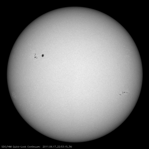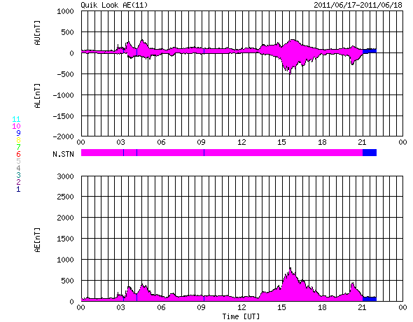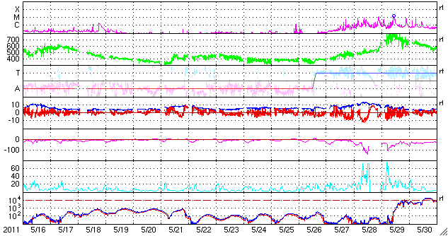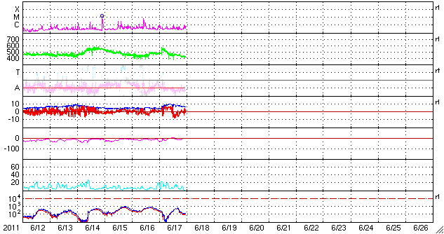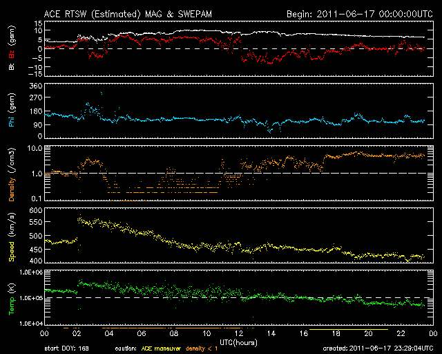2011/ 6/18 08:30 更新 太陽風に一時的な変化が発生しました。現在の太陽風は穏やかです。 担当 篠原 昨日の昼、17日11時(世界時17日2時)に、 太陽風の速度が470km/秒から550km/秒へ急に上昇する乱れがやって来ました。 同時に磁場強度やプラズマの密度も変化しましたが、 速度を含めて変化としてはいずれも小規模で、 地球磁気圏への目立った影響はありませんでした。 14日に発生したCME(15日のニュースを参照)の影響がやって来た可能性があります。 現在の太陽風は、速度は430km/秒、磁場強度6nTと、 穏やかな状態に戻っています。 磁気圏では、中規模のオーロラ活動が発生していますが、 まとまった南向き磁場の影響による一時的な変化で、 全体としては穏やかに推移しています。 太陽では、南西(右下)の1234黒点群、北東(左上)の1236黒点群、 そして、南東(左下)の活動領域などで小さな活動が発生しています。 比較的落ち着いた状態ですが、中小規模のフレアなどは発生しそうです。 SDO衛星のAIA193カメラによる太陽コロナの様子 (c) SDO (NASA) ![]() SDO衛星による太陽の可視光写真。マウスの矢印を写真に重ねると、黒点番号付きの写真に切り替わります。 (c) SDO (NASA) ![]() ACEが観測した太陽風の磁場(1番上の枠、白線は全体の強度、赤線は南北成分) および、太陽風の密度(3番目の橙線)、速度(4番目の黄線) (c) NOAA/SWPC ![]() リアルタイムAE指数 下段のAEグラフの値が高くなると、オーロラ活動が活発化しています。 (c) 京都大学, NICT ![]() 27日の太陽周期に合わせたデータプロット 太陽が同じ面を地球に向けていた27日前の変化から、今後を予想することができます。 (c) 作図:宇宙天気ニュース