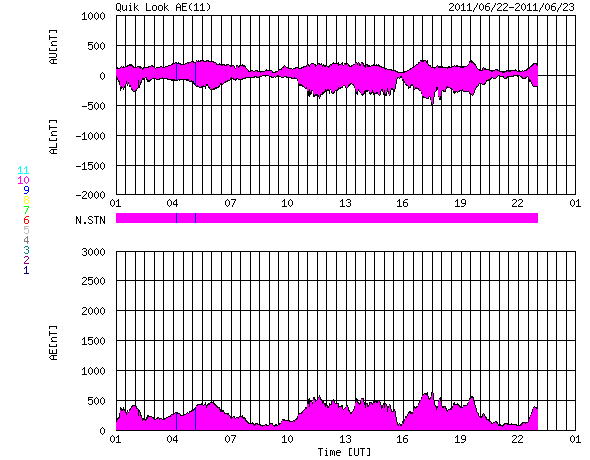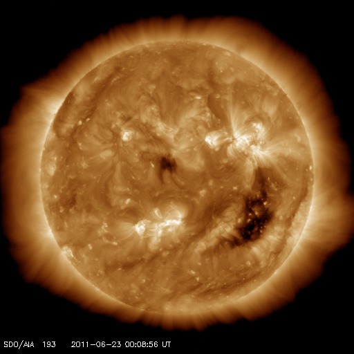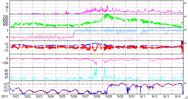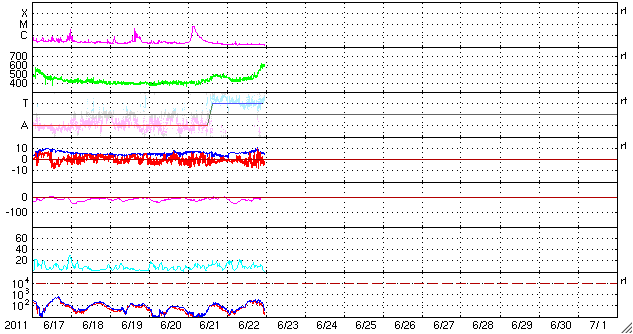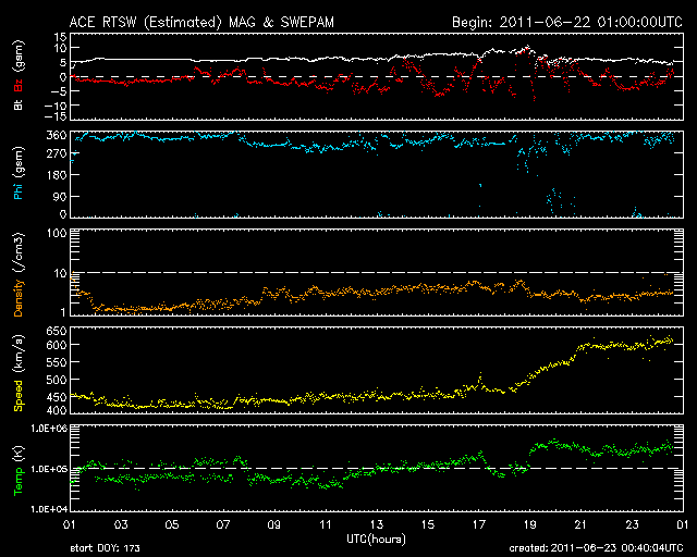 2011/ 6/23 09:40 更新 600km/秒に達する高速の太陽風が始まりました。オーロラはやや強まっています。 担当 篠原 今日未明より、太陽風速度の上昇が始まり、 現在、600km/秒の高速風に変わっています。 ACE衛星の観測によると、 23日3時(世界時22日18時)より、太陽風の速度は上昇を始め、 3時間後の23日6時(世界時22日21時)には、ほぼ600km/秒に達しました。 磁場強度は、昨日から目立った強まりのないまま推移し、 速度が上がり始める直前に8nT近くに高まった程度でした。 現在は、既に5nTと平均的な強度に下がっています。 磁場の南北成分は、比較的南寄りに推移しています。 しかし、磁場強度があまり強まらなかったため、特に強い南向き磁場も発生せず、 AE指数によると、オーロラ活動は頻繁に発生していますが、 AE指数で500nT前後と中小規模の変動に留まっています。 今朝からは太陽風の速度も高くなっているので、 もう少しオーロラの活動は強まるかもしれません。 コロナホールの広がりから、 高速の太陽風は4日程度続くのではないかと思います。 一般的には、オーロラ活動は高速風の初めに強く、次第に小さくなって行きます。 今回の太陽風の乱れでは、明日の24日頃に、 CME(太陽ガスの放出現象)の変動が重なりそうです。 強い磁場の乱れがやって来て、磁気嵐などの磁気圏擾乱をもたらす可能性があります。 放射線帯の高エネルギー電子は、低い状態です。 今回の高速風を受けて、明日以降増加を始める可能性があります。 しばらく、変化に注意してください。 太陽のフレア活動は静穏です。 X線のグラフには、変化はほとんど見られません。 SDO衛星のAIA193カメラによる太陽コロナの様子 (c) SDO (NASA) ![]() SDO衛星による太陽の可視光写真。マウスの矢印を写真に重ねると、黒点番号付きの写真に切り替わります。 (c) SDO (NASA) ![]() ACEが観測した太陽風の磁場(1番上の枠、白線は全体の強度、赤線は南北成分) および、太陽風の密度(3番目の橙線)、速度(4番目の黄線) (c) NOAA/SWPC ![]() リアルタイムAE指数 下段のAEグラフの値が高くなると、オーロラ活動が活発化しています。 (c) 京都大学, NICT ![]() 27日の太陽周期に合わせたデータプロット 太陽が同じ面を地球に向けていた27日前の変化から、今後を予想することができます。 (c) 作図:宇宙天気ニュース