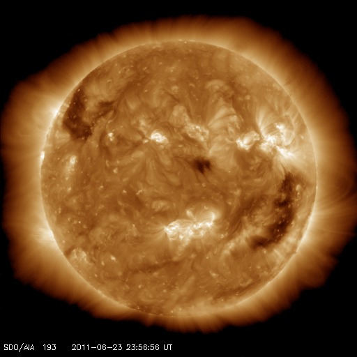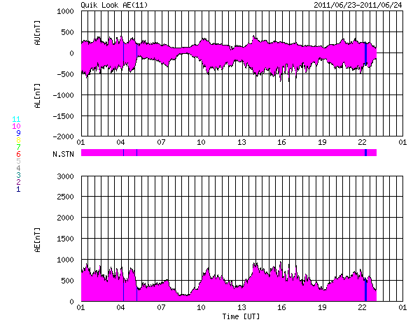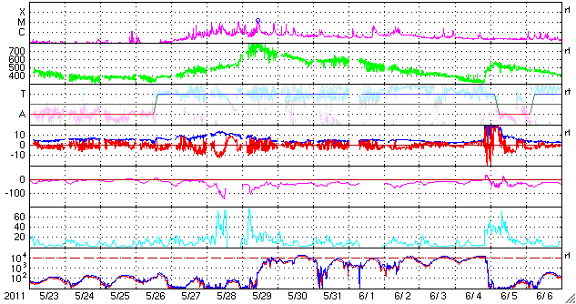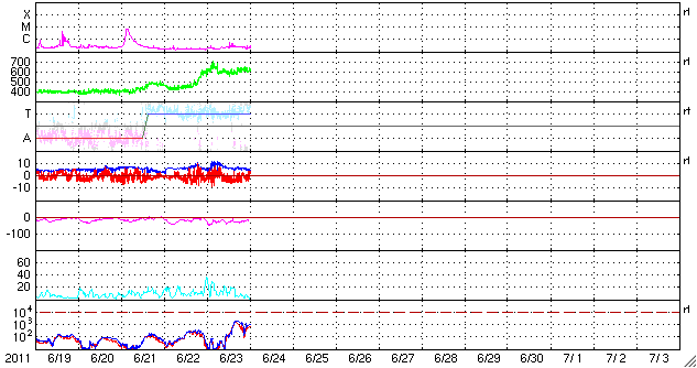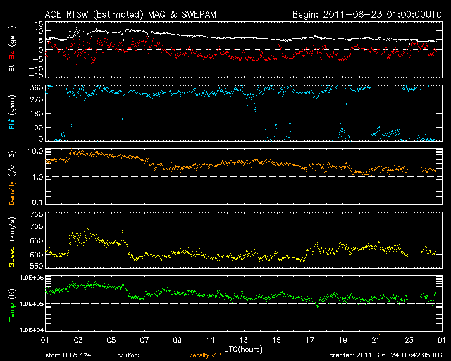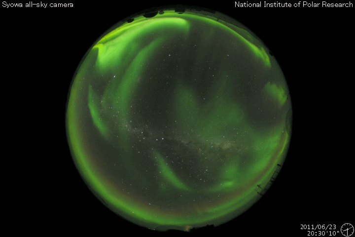 2011/ 6/24 09:43 更新 600km/秒の高速太陽風が続き、オーロラも活発に活動しています。 担当 篠原 昨日より、太陽風は600km/秒前半の高速状態が継続しています。 昨日のニュースの後には、磁場強度が10nTへ再び強まる変化も見られ、 活発なオーロラ活動も発生しています。 AE指数では、600〜800nTほどの中規模の変動が1日を通して発生しています。 南極の昭和基地で撮影されたオーロラの全天画像を、久しぶりに紹介します。 世界時の23日21時前後の1時間の様子です。 AE指数は600nTほどの変化を記録しています。 今日は、この高速太陽風にCMEの乱れが重なってやって来る可能性があります。 磁場強度が再び強まって、強い南向きの磁場がやって来ると、 高速風と重なって強いオーロラ活動や磁気嵐が発生するかもしれません。 これから明日にかけて、太陽風のデータに注意が必要です。 放射線帯の高エネルギー電子は、1000程度に上昇しています。 特に強まったという変化ではありませんが、高速風が続いているため、 引き続き上昇する可能性が高いので、注意が必要です。 太陽の活動は静穏です。 X線は、Bクラスの小さな変化が起きた程度です。 南極の昭和基地で全天カメラにより撮影された、オーロラの活動。 (c) 国立極地研究所、(動画加工 : 宇宙天気ニュース) ![]() SDO衛星のAIA193カメラによる太陽コロナの様子 (c) SDO (NASA) ![]() SDO衛星による太陽の可視光写真。マウスの矢印を写真に重ねると、黒点番号付きの写真に切り替わります。 (c) SDO (NASA) ![]() ACEが観測した太陽風の磁場(1番上の枠、白線は全体の強度、赤線は南北成分) および、太陽風の密度(3番目の橙線)、速度(4番目の黄線) (c) NOAA/SWPC ![]() リアルタイムAE指数 下段のAEグラフの値が高くなると、オーロラ活動が活発化しています。 (c) 京都大学, NICT ![]() 27日の太陽周期に合わせたデータプロット 太陽が同じ面を地球に向けていた27日前の変化から、今後を予想することができます。 (c) 作図:宇宙天気ニュース