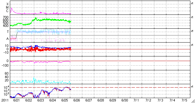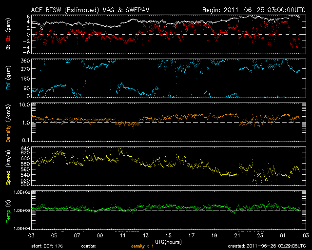 2011/ 6/26 11:29 更新 太陽風速度は550km/秒に下がり、高速風は弱まりつつあります。 担当 篠原 太陽風の速度は、昨日いっぱいは600km/秒近い高い速度を保っていましたが、 今日に入った頃から一段下がり、現在は550km/秒付近で推移しています。 高速風は続いていますが、勢いは弱まりつつあります。 これから、SDO衛星AIA193の太陽コロナ写真の西側(右側)に見える、 小さなコロナホールの影響が多少あるかもしれませんが、 基本的には、太陽風は明日、明後日と穏やかになっていくでしょう。 磁気圏のオーロラの活動もだいぶ静かになりました。 今日のAE指数は、300nTくらいの小規模の変化だけになっています。 放射線帯の高エネルギー電子は更に上昇して、10,000の警戒レベルに達しています。 これ以上大きく上がることはなさそうですが、 しばらく高めの状態が続きそうです。 太陽のフレア活動は、穏やかです。 X線のグラフは特に変化していません。 黒点も、大きな姿を見せていた1236黒点群が西の端に没して、 残るのは小さな黒点ばかりです。 SDO衛星のAIA193カメラによる太陽コロナの様子 (c) SDO (NASA) ![]() SDO衛星による太陽の可視光写真。マウスの矢印を写真に重ねると、黒点番号付きの写真に切り替わります。 (c) SDO (NASA) ![]() ACEが観測した太陽風の磁場(1番上の枠、白線は全体の強度、赤線は南北成分) および、太陽風の密度(3番目の橙線)、速度(4番目の黄線) (c) NOAA/SWPC ![]() リアルタイムAE指数 下段のAEグラフの値が高くなると、オーロラ活動が活発化しています。 (c) 京都大学, NICT ![]() 27日の太陽周期に合わせたデータプロット 太陽が同じ面を地球に向けていた27日前の変化から、今後を予想することができます。 (c) 作図:宇宙天気ニュース