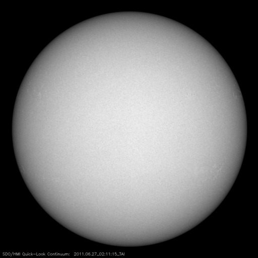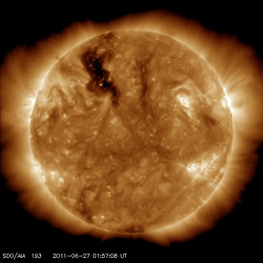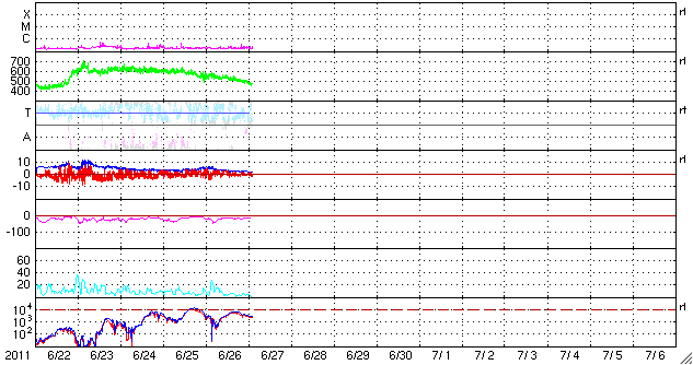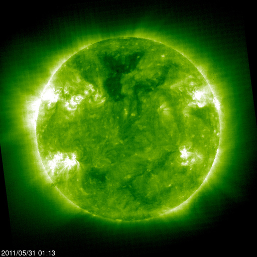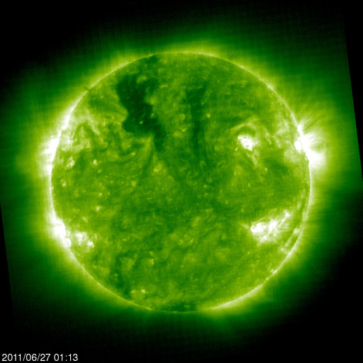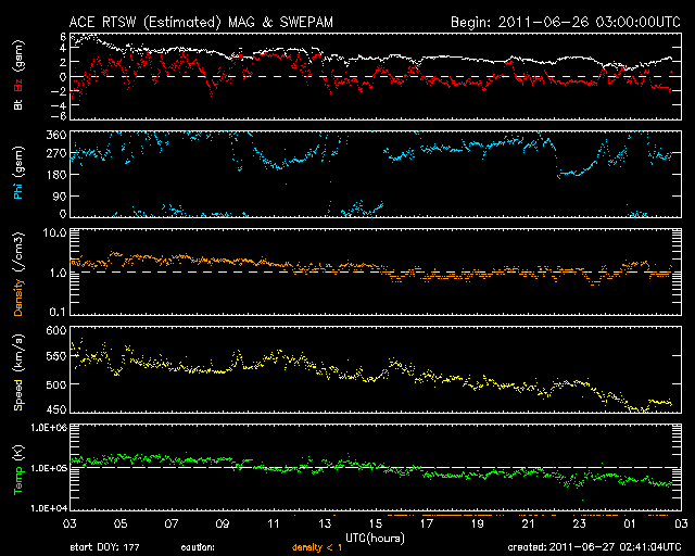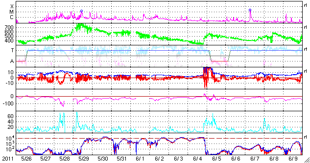 2011/ 6/27 11:41 更新 高速太陽風は終わりつつあります。太陽もほとんど黒点が見えません。 担当 篠原 太陽風の速度はゆっくりと下がり、470km/秒ほどになっています。 高速太陽風の領域は、ほぼ通り過ぎたと言えそうです。 今後も速度は下がり、 明日には平均的な状態(400km/秒付近)になっていそうです。 太陽風は、磁場強度も2〜3nTと弱まっています。 このため、磁気圏も静穏で、 AE指数の変化はすっかり小さくなっています。 太陽の北東(左上)側には、濃いコロナホールが縦(南北)に伸びています。 この様子を、27日前と比べてみましょう。 今日の最初の写真は、今日(6月27日)と27日前(5月31日)のSOHO EIT195です。 どちらも北半球側に縦に伸びるコロナホールが見えますが、 その位置はすこし東側にずれています。 この様子だと、高速風の到来は全周期よりも1〜2日遅れるかもしれません。 前周期は、世界時では6月4日後半に高速風が始まっています(27日周期の図を参照)。 今回は少し遅れて、7月3日頃の到来となるかもしれません。 まだ1週間近く先の変動ですが、この点にも注目して下さい。 昨日10,000を超えていた放射線帯の高エネルギー電子は、 今日は少し下がって、8,000ほどになっています。 この後はゆっくりと減少して行くでしょう。 太陽のフレア活動も穏やかです。 X線のグラフはほとんど変化していません。 黒点も、目立つものはとうとうなくなってしまいました。 SOHO衛星 EIT195カメラの映像 (c) SOHO (ESA & NASA)