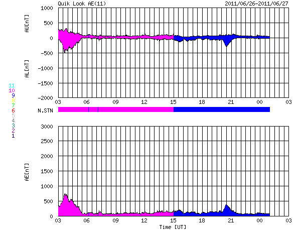 SDO衛星のAIA193カメラによる太陽コロナの様子 (c) SDO (NASA) ![]() SDO衛星による太陽の可視光写真。マウスの矢印を写真に重ねると、黒点番号付きの写真に切り替わります。 (c) SDO (NASA) ![]() ACEが観測した太陽風の磁場(1番上の枠、白線は全体の強度、赤線は南北成分) および、太陽風の密度(3番目の橙線)、速度(4番目の黄線) (c) NOAA/SWPC ![]() リアルタイムAE指数 下段のAEグラフの値が高くなると、オーロラ活動が活発化しています。 (c) 京都大学, NICT ![]() 27日の太陽周期に合わせたデータプロット 太陽が同じ面を地球に向けていた27日前の変化から、今後を予想することができます。 (c) 作図:宇宙天気ニュース