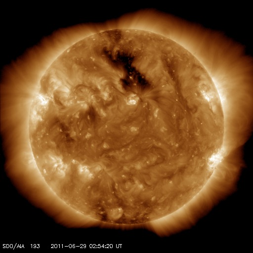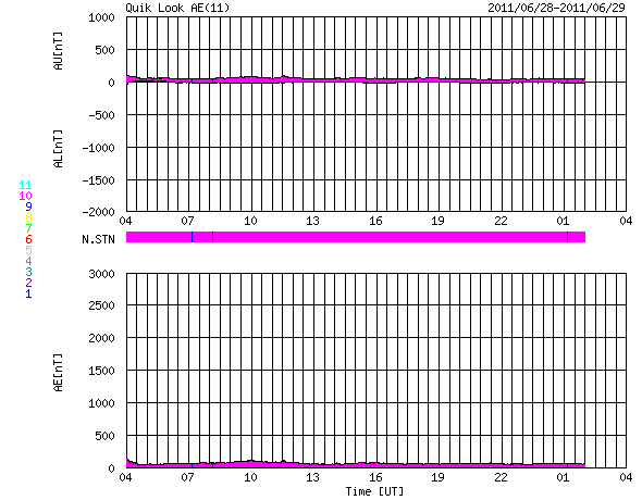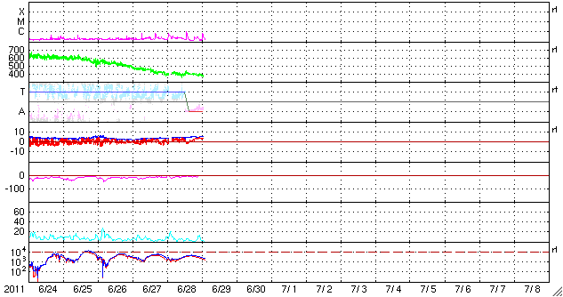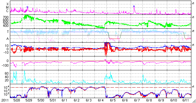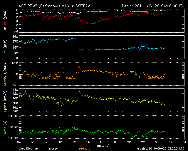 2011/ 6/29 12:33 更新 平均的な速度の太陽風が続いています。磁気圏は静穏です。 担当 篠原 太陽風は、400〜380km/秒と平均的な速さで安定しています。 磁場強度も、4〜5nTと平均的な強さで落ち着いています。 28日22時(世界時28日13時)頃にセクターの切り替わりが来た様で、 磁場の方向を示すグラフが、その前後で大きく変化しています。 太陽風が乱れているという状況ではありません。 磁気圏もとても静かで、 オーロラの活動度を示すAE指数は全く変化していません。 これは、太陽風磁場の南北成分(ACEの赤線)が ほとんどの時間帯で北(プラス)を向いていたことが効いているのでしょう。 明後日の7月1日までは、このまま静かな状態が続くでしょう。 その後、コロナホールによる高速太陽風が到来すると思われます。 今日のSDO衛星AIA193では、 コロナホールは太陽の中心線を少し通過した所です。 太陽では、小規模ですが半日ごとにフレアが発生して、 グラフが面白い変化になっています。 ただし、発生場所は、これまでは北西の1236黒点群でしたが、 今朝の(グラフの最後の)B9.6フレアは南西の1240黒点群で発生しています。 その他に黒点群は、太陽の中心付近に1242黒点群が、 東の端近くに1243黒点群が、どちらも微かに見えています。 SDO衛星のAIA193カメラによる太陽コロナの様子 (c) SDO (NASA) ![]() SDO衛星による太陽の可視光写真。マウスの矢印を写真に重ねると、黒点番号付きの写真に切り替わります。 (c) SDO (NASA) ![]() ACEが観測した太陽風の磁場(1番上の枠、白線は全体の強度、赤線は南北成分) および、太陽風の密度(3番目の橙線)、速度(4番目の黄線) (c) NOAA/SWPC ![]() リアルタイムAE指数 下段のAEグラフの値が高くなると、オーロラ活動が活発化しています。 (c) 京都大学, NICT ![]() 27日の太陽周期に合わせたデータプロット 太陽が同じ面を地球に向けていた27日前の変化から、今後を予想することができます。 (c) 作図:宇宙天気ニュース