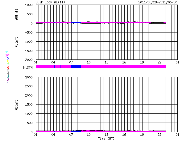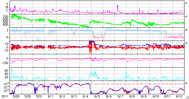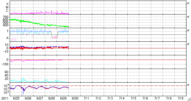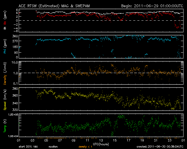 2011/ 6/30 09:39 更新 太陽風は低速になり、磁気圏もとても静かです。1242黒点群が少し大きくなっています。 担当 篠原 太陽風の速度は340km/秒へ下がり、すっかり低速風になっています。 磁場強度は、4nTと平均的な強さで安定しています。 磁場の南北成分は、北向きの傾向が続いていて、 その影響でAE指数はぱったりと変化がなくなっています。 SDO AIA193では、コロナホールは更に西(右)へ動いていて、 地球への影響が始まる目安の位置に近づいています。 今回のコロナホールは緯度がやや高いところにあるため、 地球への影響は及びにくい位置関係です。 一方、コロナホールとしは十分に濃く見えていて、 高速風そのものはしっかりと吹きだしていそうです。 どの程度の太陽風がやって来るでしょうか。 明日か明後日か、始まりのタイミングを含めてしばらく注目してください。 太陽では、中央の1242黒点群の規模が拡大しています。 昨夕のB5.5の小さなフレアを含めて、小さな活動を強めています。 更に発達する様だと、活動の規模も大きくなるかもしれません。 SDO衛星のAIA193カメラによる太陽コロナの様子 (c) SDO (NASA) ![]() SDO衛星による太陽の可視光写真。マウスの矢印を写真に重ねると、黒点番号付きの写真に切り替わります。 (c) SDO (NASA) ![]() ACEが観測した太陽風の磁場(1番上の枠、白線は全体の強度、赤線は南北成分) および、太陽風の密度(3番目の橙線)、速度(4番目の黄線) (c) NOAA/SWPC ![]() リアルタイムAE指数 下段のAEグラフの値が高くなると、オーロラ活動が活発化しています。 (c) 京都大学, NICT ![]() 27日の太陽周期に合わせたデータプロット 太陽が同じ面を地球に向けていた27日前の変化から、今後を予想することができます。 (c) 作図:宇宙天気ニュース