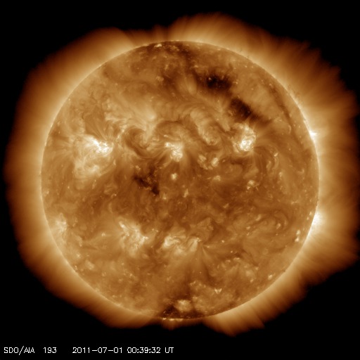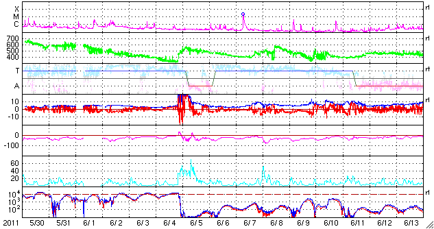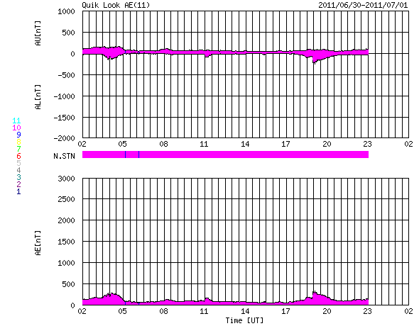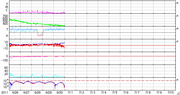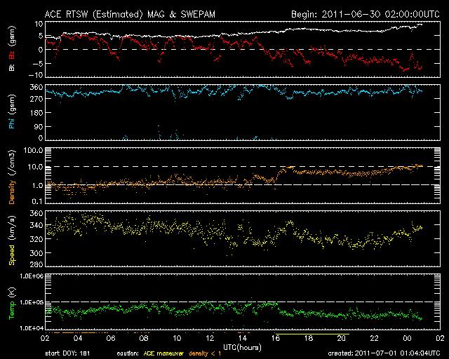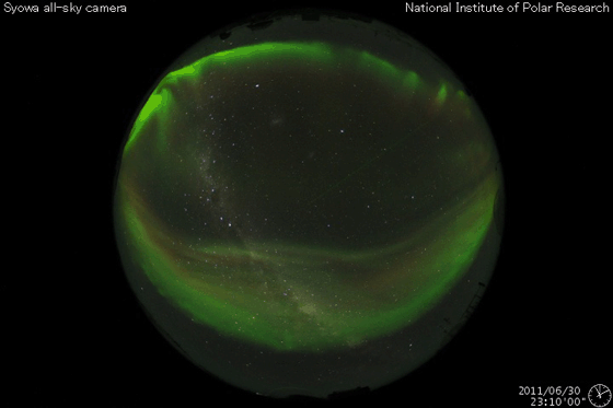 2011/ 7/ 1 10:04 更新 太陽風の磁場強度が強まり、オーロラを強めています。コロナホールの影響が始まったのかもしれません。 担当 篠原 コロナホールの影響が始まったのでしょうか。 昨夜遅くから、小幅ですが太陽風に変化が現れています。 太陽風の磁場強度は5nTから9nTほどに強まり、 プラズマの密度も1個/cm^3から10個/cm^3へ増加しています。 太陽風の速度はまだ何も変化はなく、340km/秒程度と低速の状態です。 磁場が強まり始めるとともに、磁場の南北成分は南向きになり、 -5nTを超える程度のやや強めの南向きになっています。 この影響で磁気圏活動も強まり始めているようです。 AE指数のグラフは、まだ小さな変化しか見られませんが、 このグラフの直後の時間帯に、 昭和基地できれいなオーロラの活動が撮影されています。 動画をご覧ください。 公開されている写真の時間間隔が短くなり、 より臨場感のある動きを楽しめるようになりました。 その代わり、動画サイズがかなり大きくなっていますのでご注意下さい。 この変化がコロナホールの影響によるものであれば、 この後から速度にも変化が始まるでしょう。 磁場の南向きの傾向が続けば、引き続き活発なオーロラ活動が見られるでしょう。 今日から明後日にかけて、太陽風は擾乱の傾向が続くかもしれません。 一方、太陽の活動は静穏です。 目立ったフレアの活動はありません。 黒点も太陽の中央部に小さな群が新しく現れた程度です。 南極の昭和基地で全天カメラにより撮影された、オーロラの活動。 (c) 国立極地研究所、(動画加工 : 宇宙天気ニュース) ![]() SDO衛星のAIA193カメラによる太陽コロナの様子 (c) SDO (NASA) ![]() SDO衛星による太陽の可視光写真。マウスの矢印を写真に重ねると、黒点番号付きの写真に切り替わります。 (c) SDO (NASA) ![]() ACEが観測した太陽風の磁場(1番上の枠、白線は全体の強度、赤線は南北成分) および、太陽風の密度(3番目の橙線)、速度(4番目の黄線) (c) NOAA/SWPC ![]() リアルタイムAE指数 下段のAEグラフの値が高くなると、オーロラ活動が活発化しています。 (c) 京都大学, NICT ![]() 27日の太陽周期に合わせたデータプロット 太陽が同じ面を地球に向けていた27日前の変化から、今後を予想することができます。 (c) 作図:宇宙天気ニュース